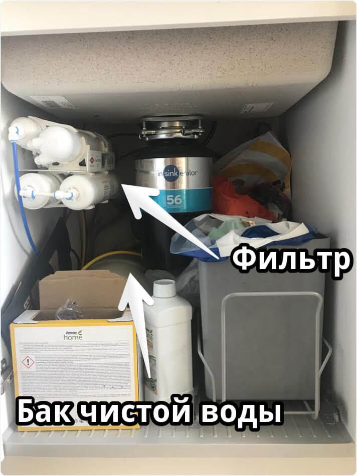 Компактность. Так как в фильтре не используются громоздкие колбы стандарта 10" Slim Line, он действительно занимает меньше места под кухонной мойкой. Благодаря компактным размерам фильтра в стандартной кухонной секции 60 х 60 см также помещается измельчитель пищевых отходов и мусорное ведро. Фильтр крепится на стенку с помощью кронштейна, а бак можно положить под него.