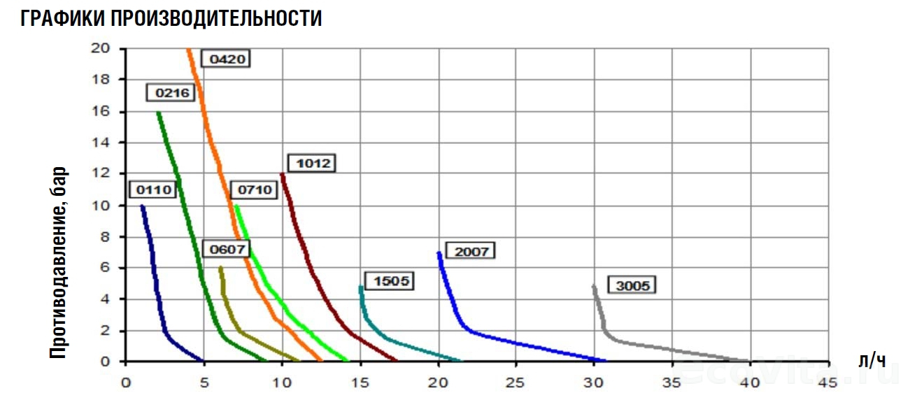 | Расход, л/ч | Противодавление, бар | Объем ипульса, мл |