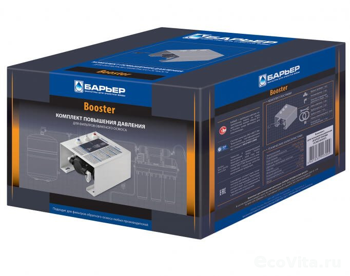 Комплект Барьер Booster для повышения входного давления водопроводной воды перед проточным фильтром обратного осмоса. Подходит для систем обратного осмоса с мембранами от 50 до 150 gal от любых производителей.
