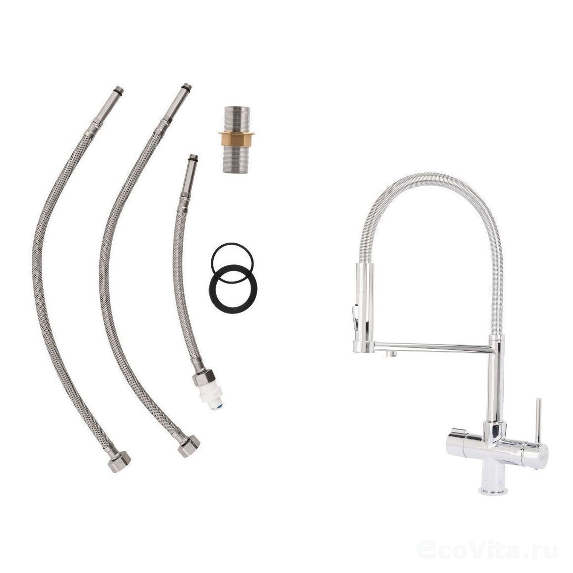 - Полный набор аксессуаров для монтажа: подводка ½ дюйма, фильтр-переходник, уплотнения, резьба-втулка и гайка.