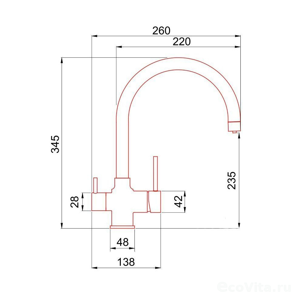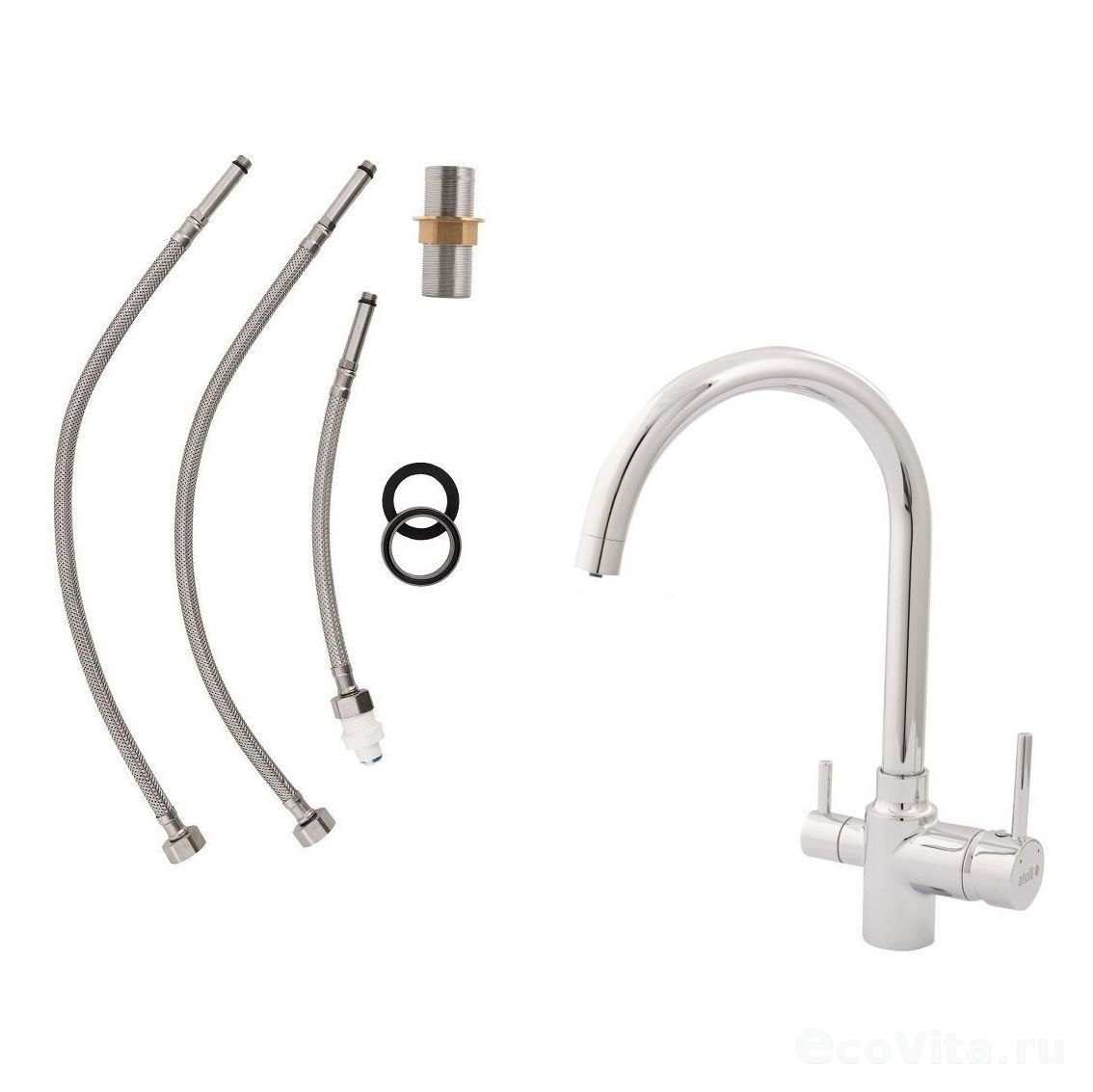 Этот смеситель подключается одновременно к фильтрующему устройству и централизованной системе водоснабжения, обеспечивая независимую подачу как очищенной питьевой воды, так и стандартной водопроводной (холодной и горячей).