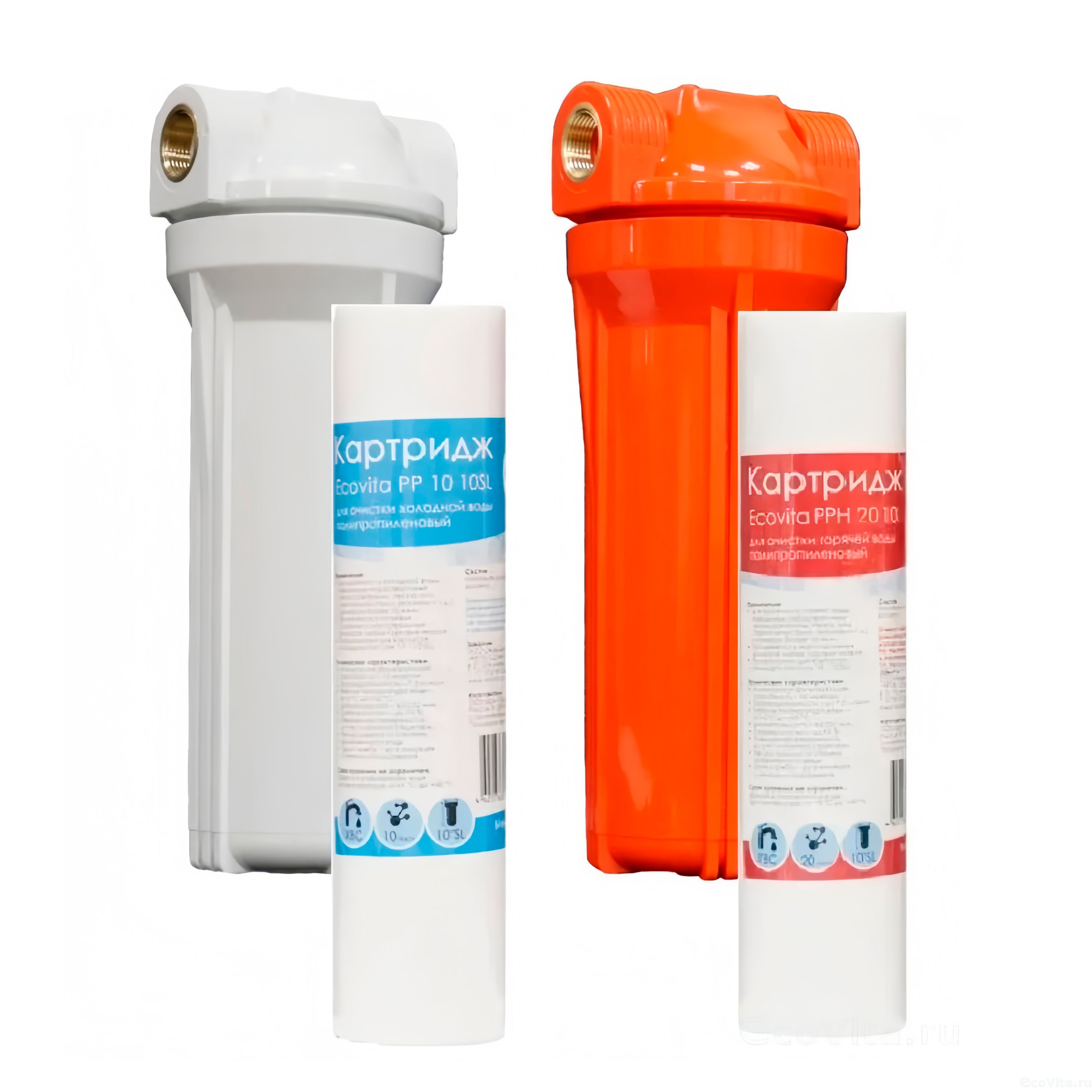 Комплект магистральных фильтров Ecovita 10SL 1/2" для очистки холодной и горячей воды от механических примесей (ржавчина, окалина, песок и т.д.).