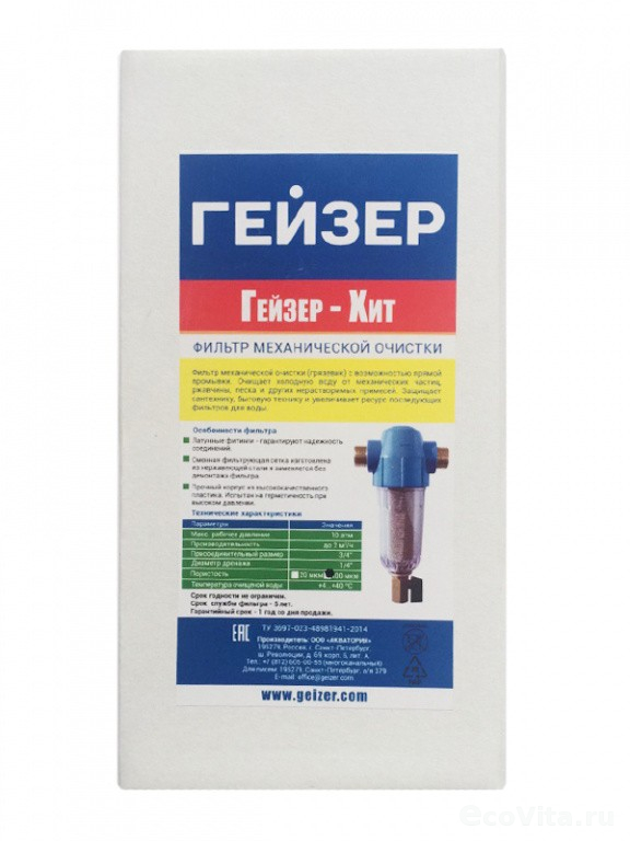 Сетчатый фильтр Гейзер Хит 1” 100 мкм предохраняет от попадания в водопроводную систему твердых взвешенных частиц, размером более 100 мкм: ржавчины, пеньки и песка и т.п. Механические загрязнения, собранные внутри колбы фильтра, могут быть легко удалены с помощью промывки. Фильтр помогает увеличить ресурс службы бытовой техники, сантехники, и последующих фильтров воды.