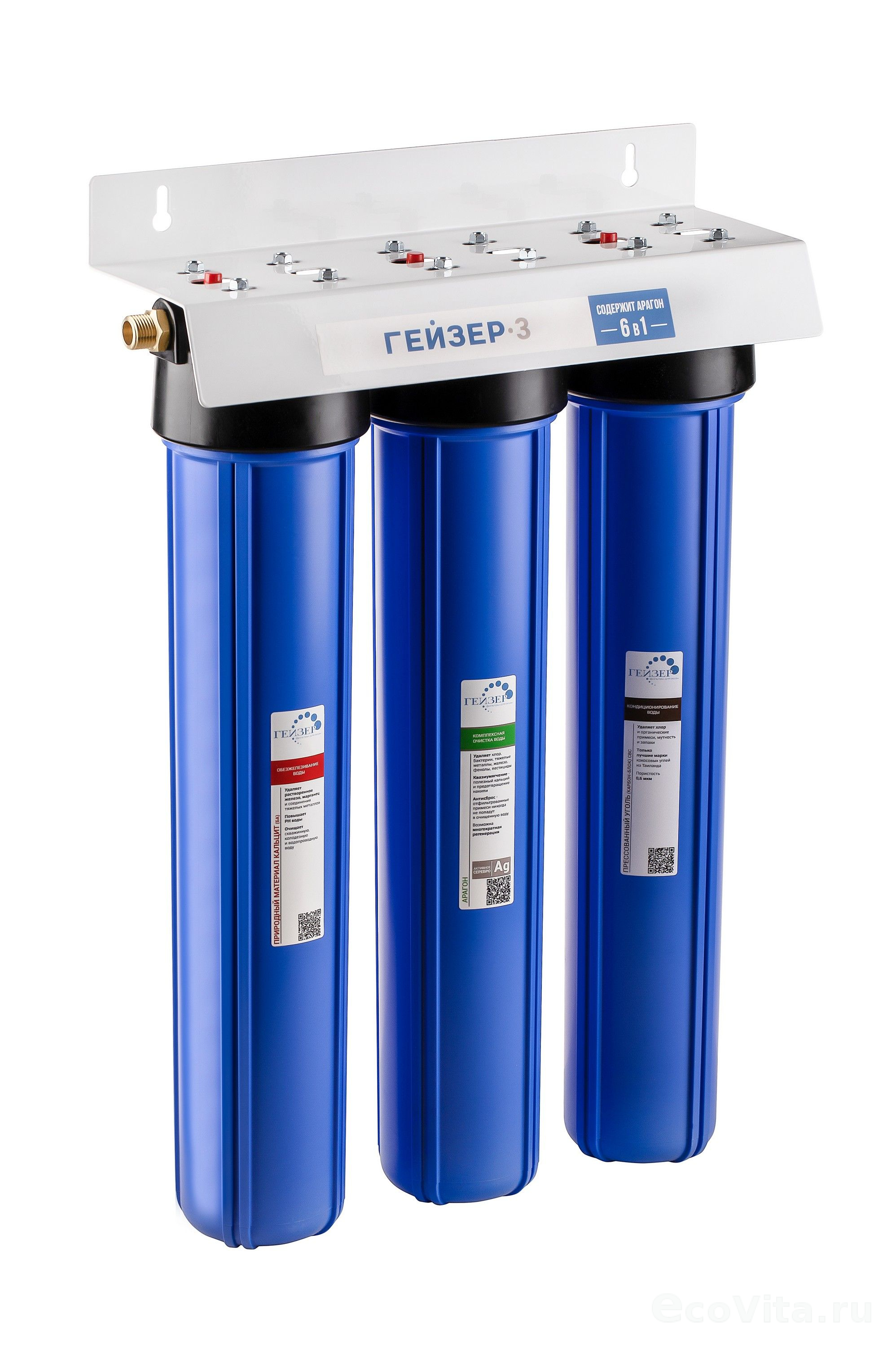 - 2 картриджа Арагон Ж 10SL (6-8 л/мин) – предназначены для комплексной очистки воды от механических примесей, железа, марганца, тяжелых металлов, хлора и органических соединений. Возможна регенерация картриджей в домашних условиях (2-3 регенерации). В комплекте к фильтру поставляются 2 картриджа, скрученных вертикально специальным резьбовым соединителем;