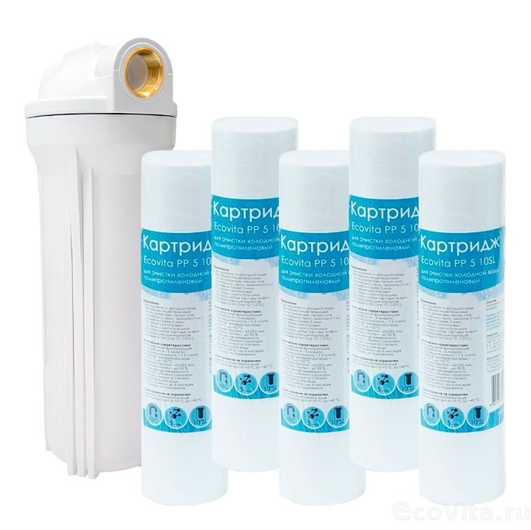 Комплект из магистрального фильтра Ecovita 3/4" 10SL с 5 картриджами PP 5 10SL для очистки холодной воды от механических примесей (ржавчина, окалина, песок и т.д.).