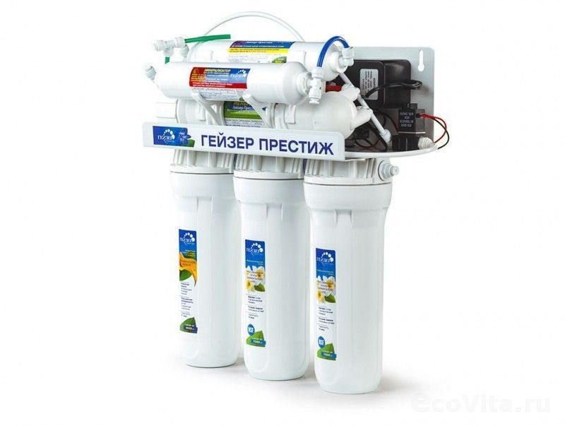 Фильтр Гейзер Престиж ПМ создан с использованием технологии обратного осмоса. Фильтрация воды осуществляется через полупроницаемую мембрану, поры которой пропускают только молекулы воды и кислорода. Так как размер молекул большинства примесей, а также бактерий и вирусов значительно больше молекул воды, мембрана успешно задерживает их. Эффективно очищает воду с повышенной жесткостью. Мембрана обладает увеличенным ресурсом. В фильтре используется трехступенчатая предварительная очистка воды и помпа повышения давления.