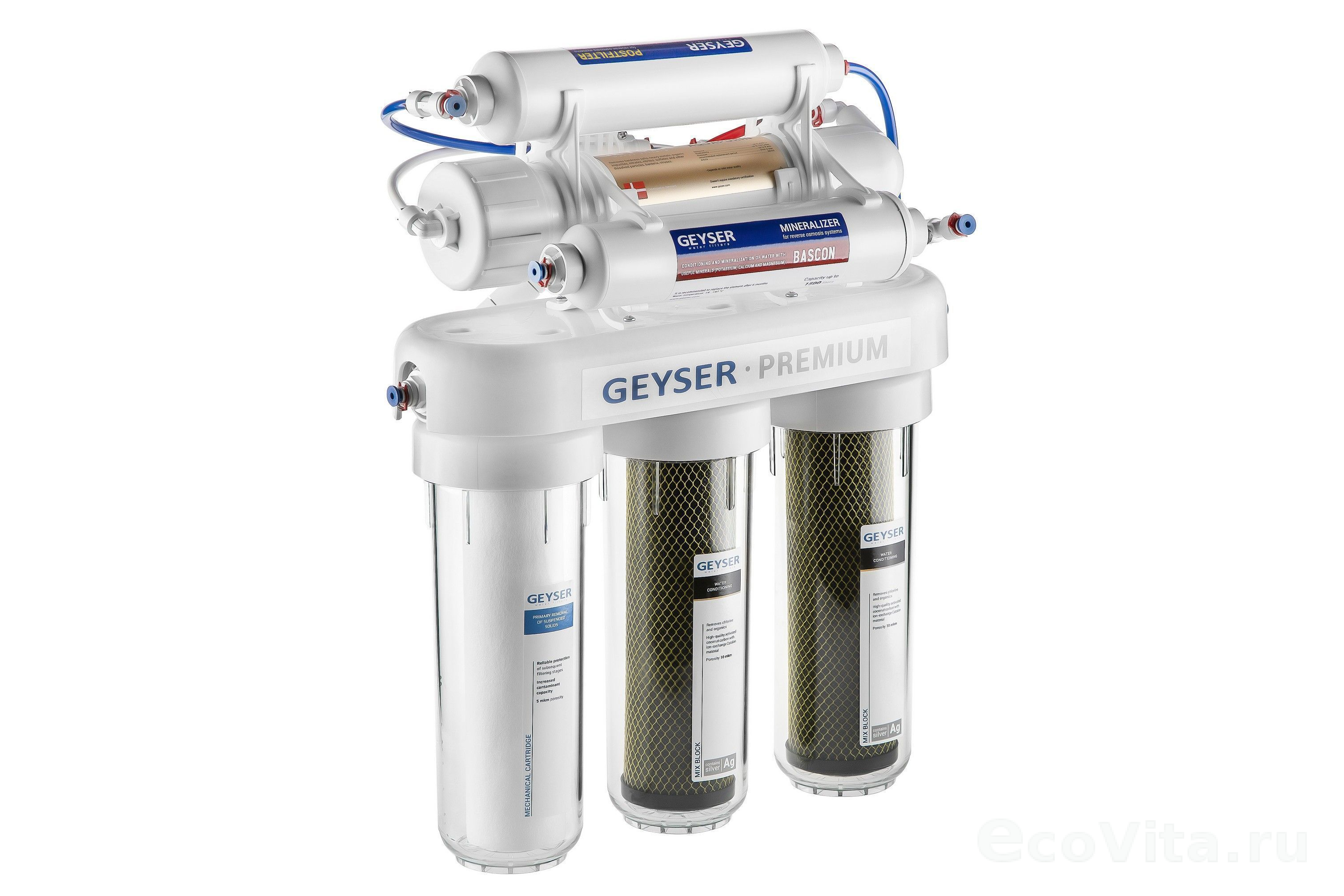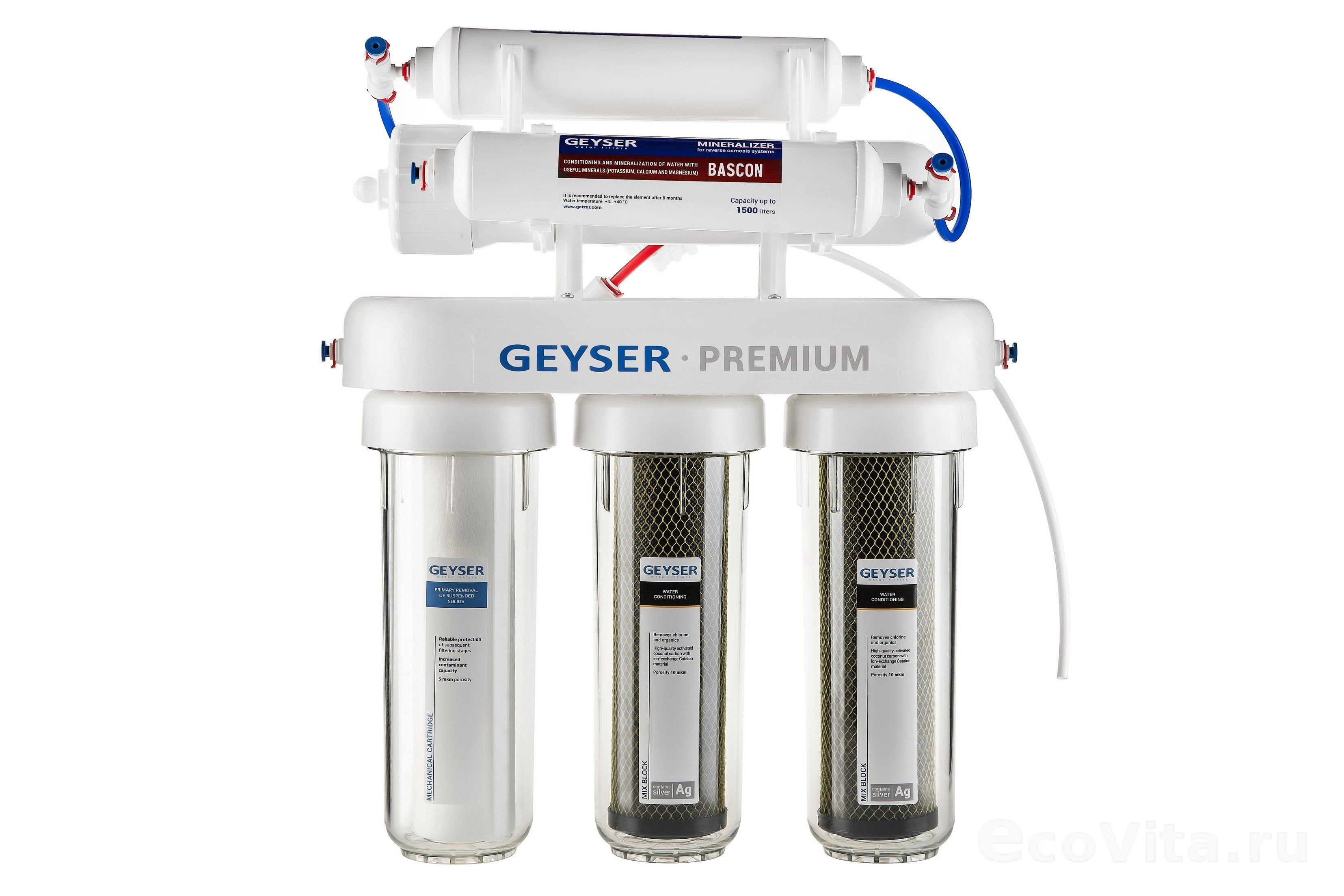 Система обратного осмоса Гейзер Премиум используется для доочистки водопроводной воды от вредных примесей, таких как железо, бактерии, хлорорганические и органические примеси, хлор, тяжелые металлы, нитраты, механические частицы, избыток солей жесткости, а также для корректировки ее минерального состава, что делает воду абсолютно чистой и безопасной.