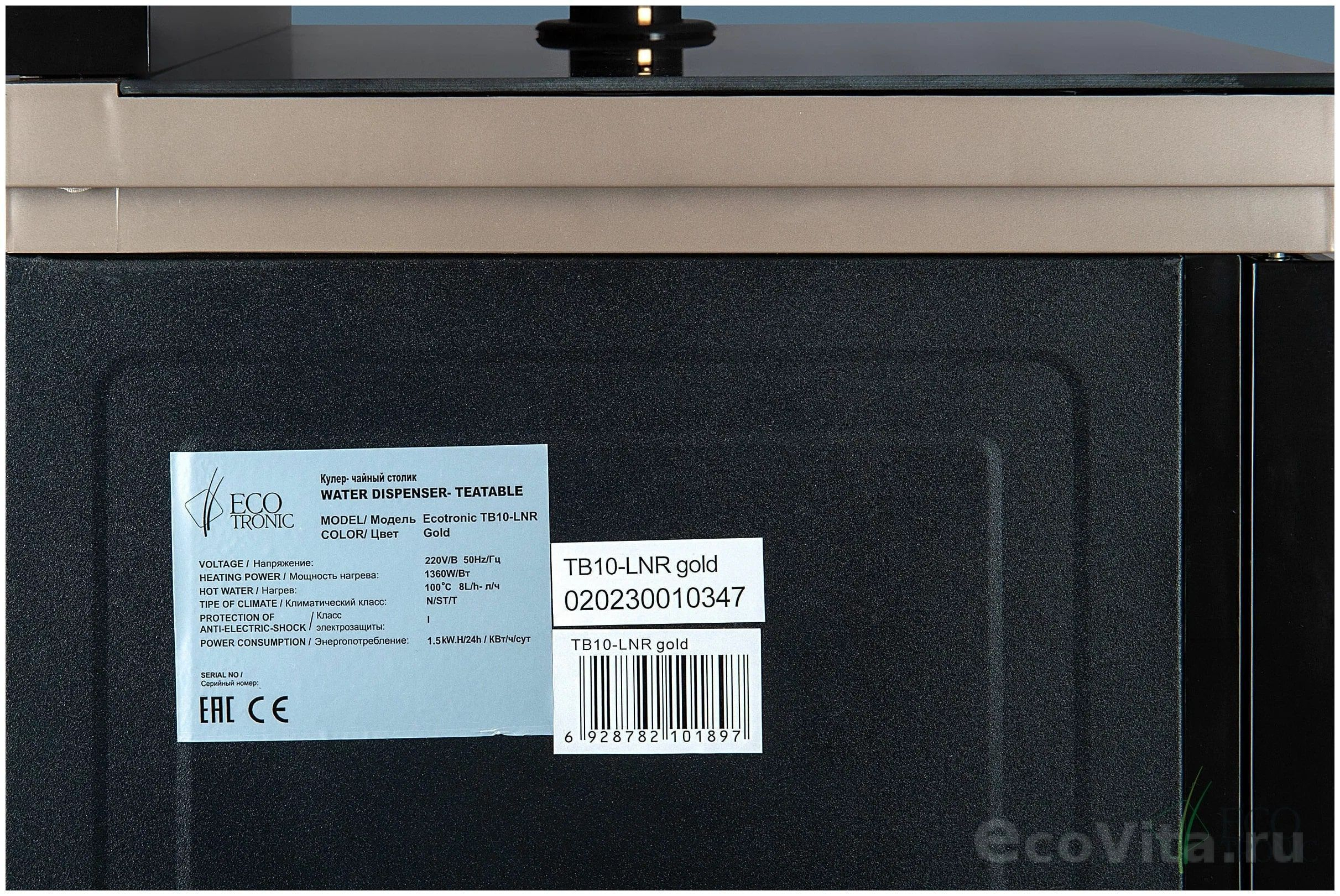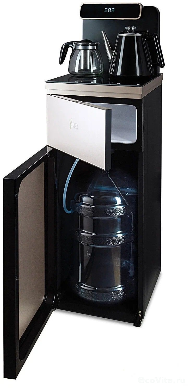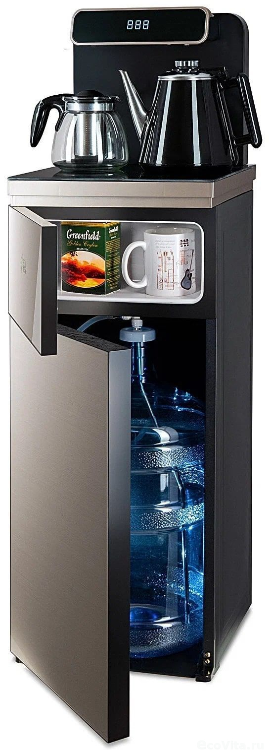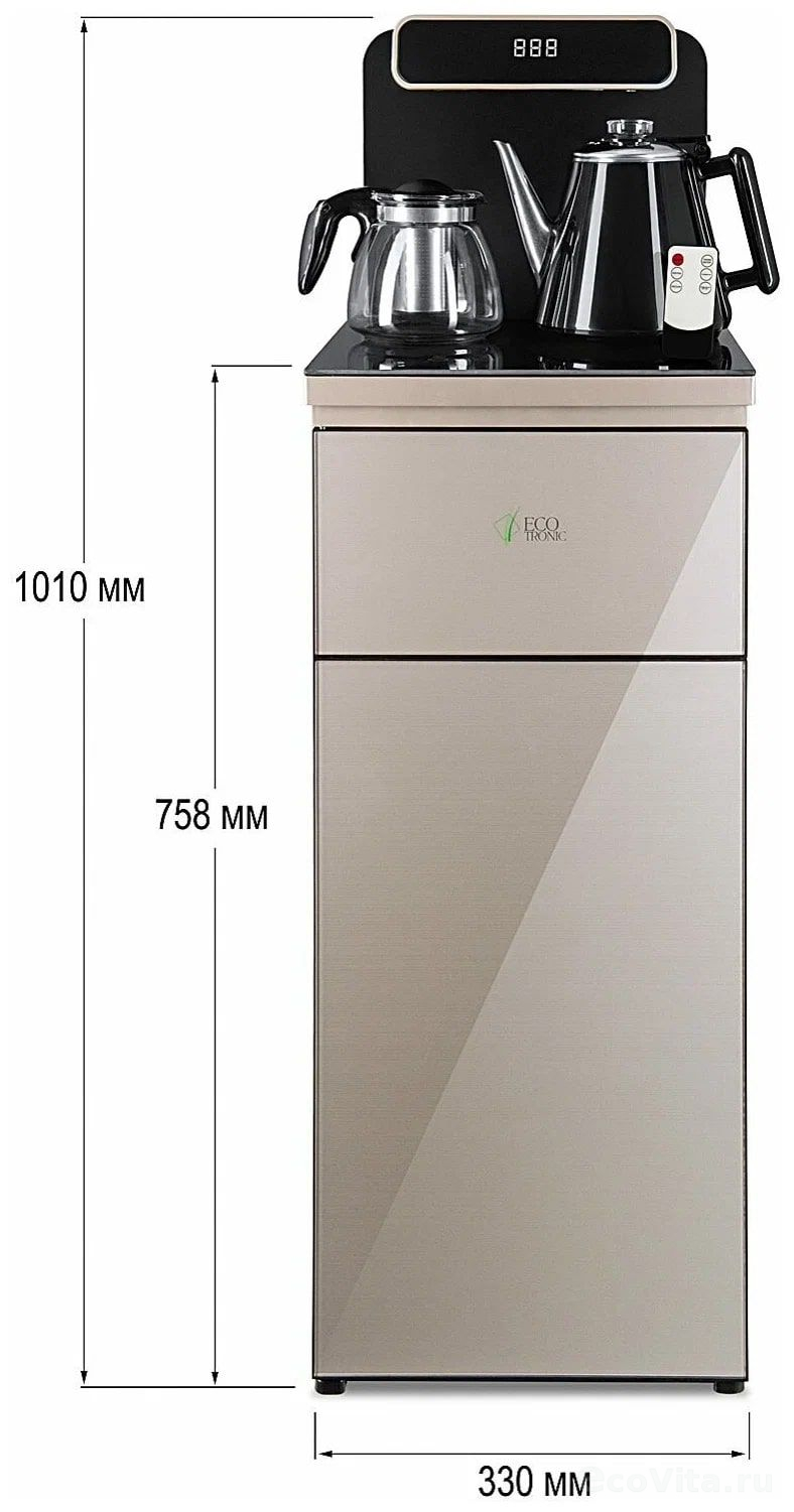 Тиабар Ecotronic TB10-LNR gold – это напольный кулер с чайным столиком. Пульт дистанционного управления. Нижняя загрузка бутыли. Два чайника – для кипячения (изотермический) и заварочный. Без охлаждения, только нагрев. Нагрев воды в чайнике до 100°С. Шкафчик для хранения.