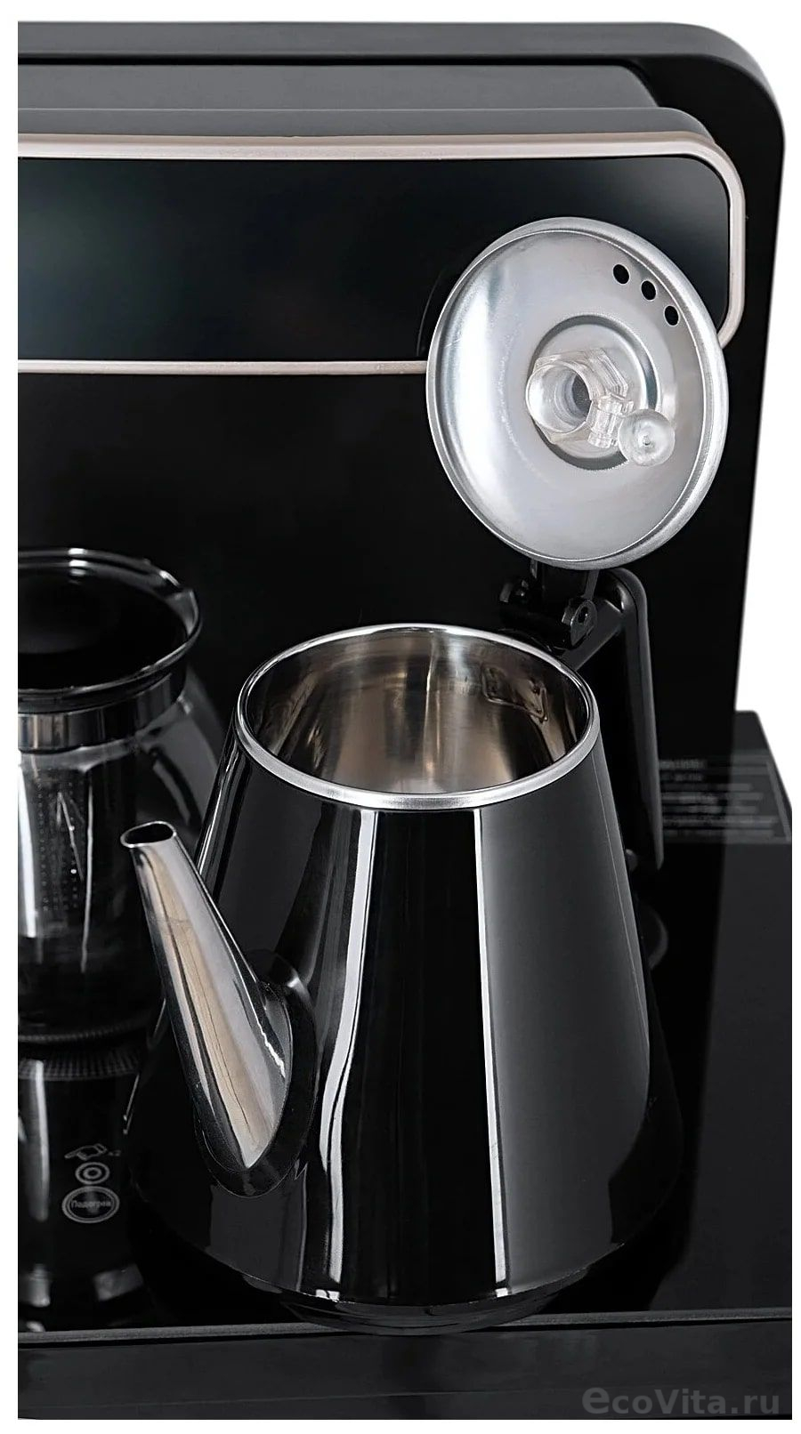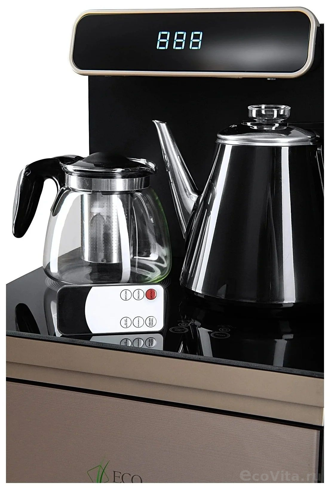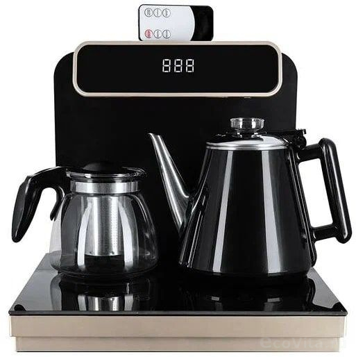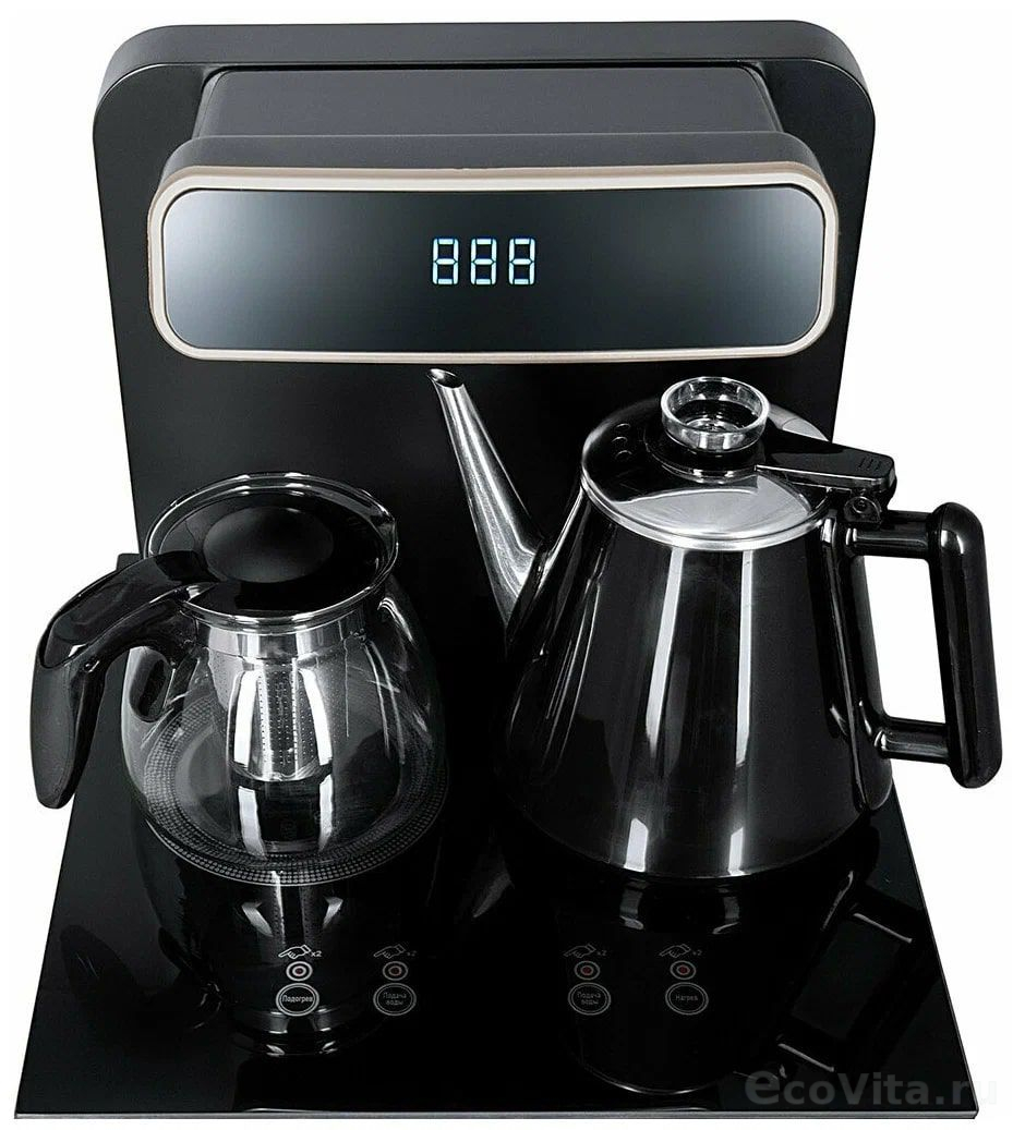 - Информационный дисплей в верхней части совмещен с кранами подачи воды. Два чайника, для кипячения и заварочный. Заварочному чайнику можно включить режим постоянного подогрева (~ до 60°С). Чайник кипячения изотермический – меньше греется, лучше сохраняет температуру. Подача воды в него возможна без открытия крышки. Нагрев воды в чайнике включается вручную. Автоотключение нагрева при температуре 100°С.