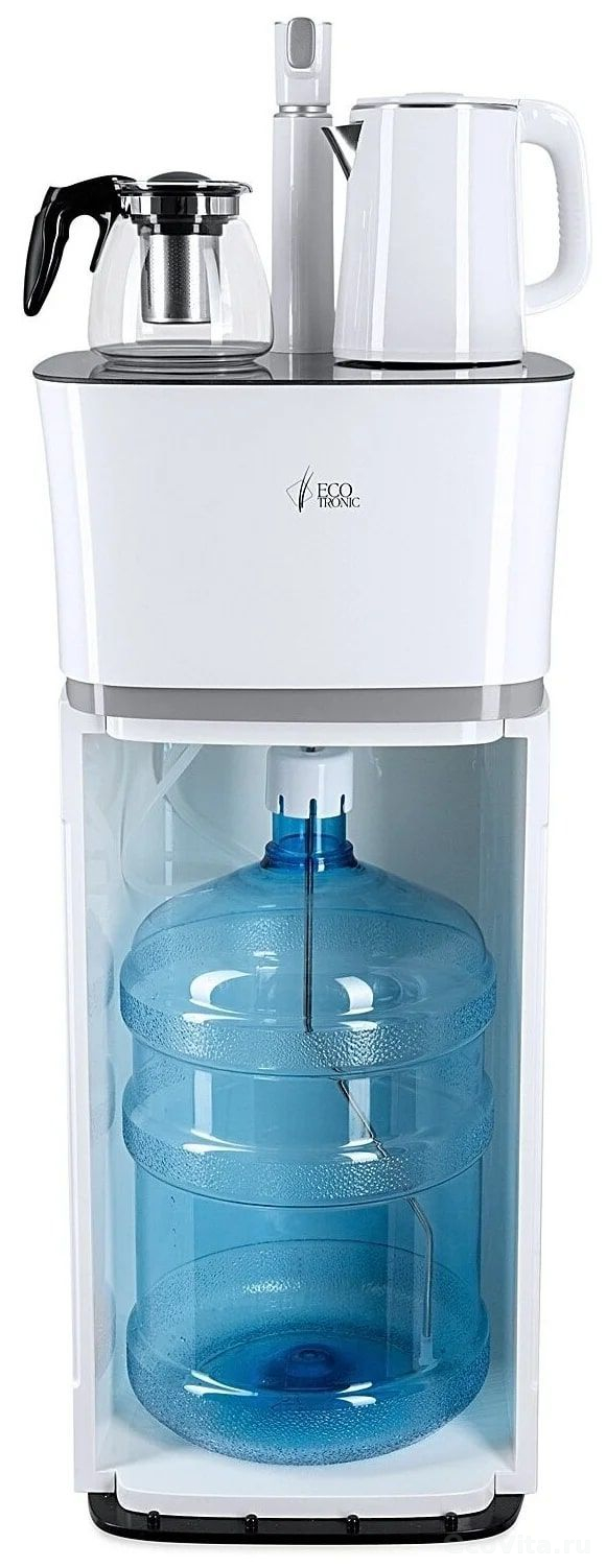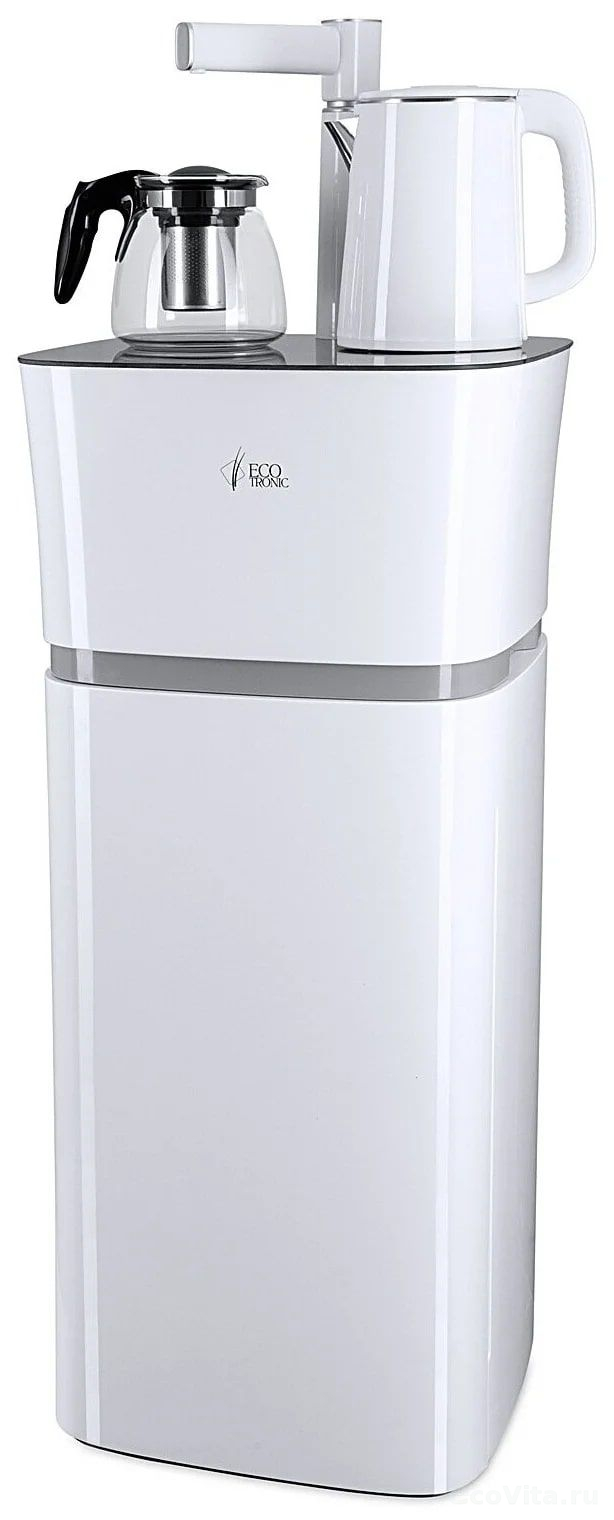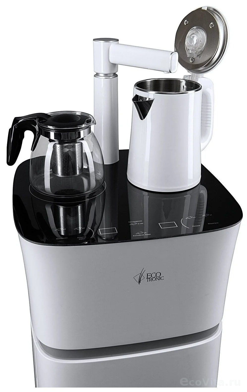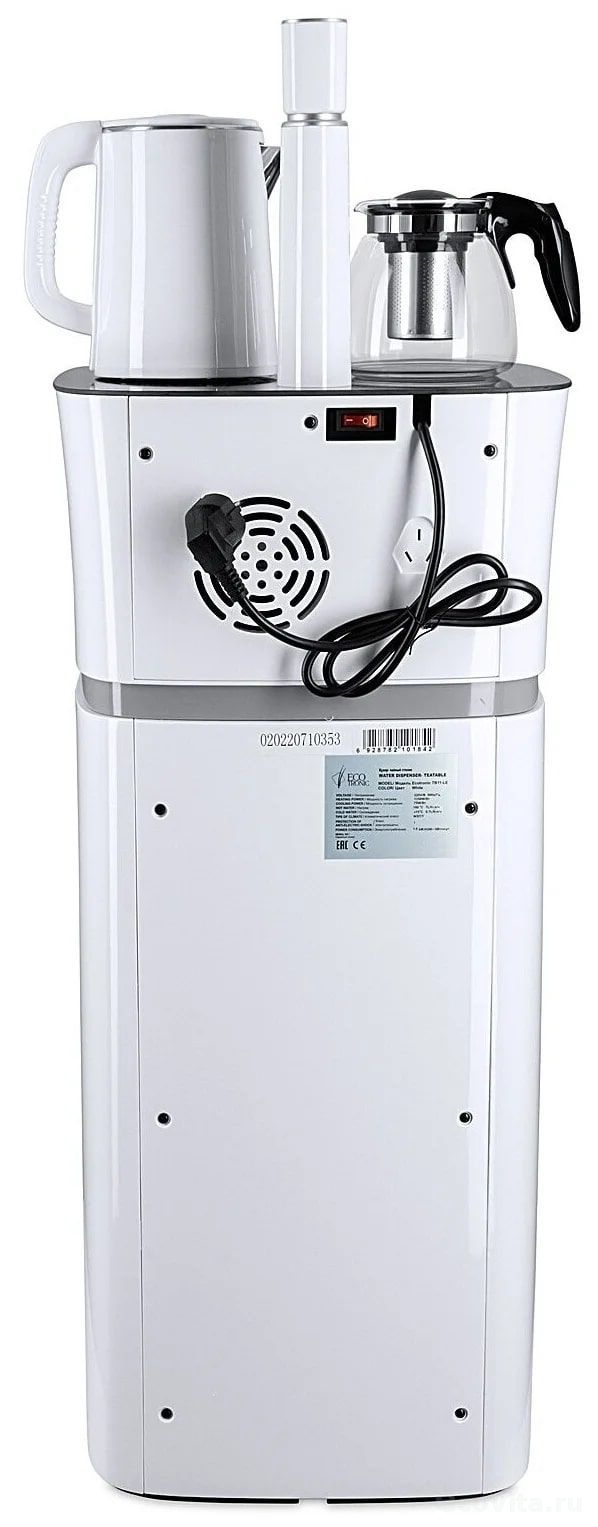 Тиабар Ecotronic TB11-LE white – это напольный кулер с чайным столиком. Нижняя загрузка бутыли, электронное охлаждение. Нагрев воды в чайнике до 100°С. Два чайника – для кипячения (изотермический) и заварочный.
