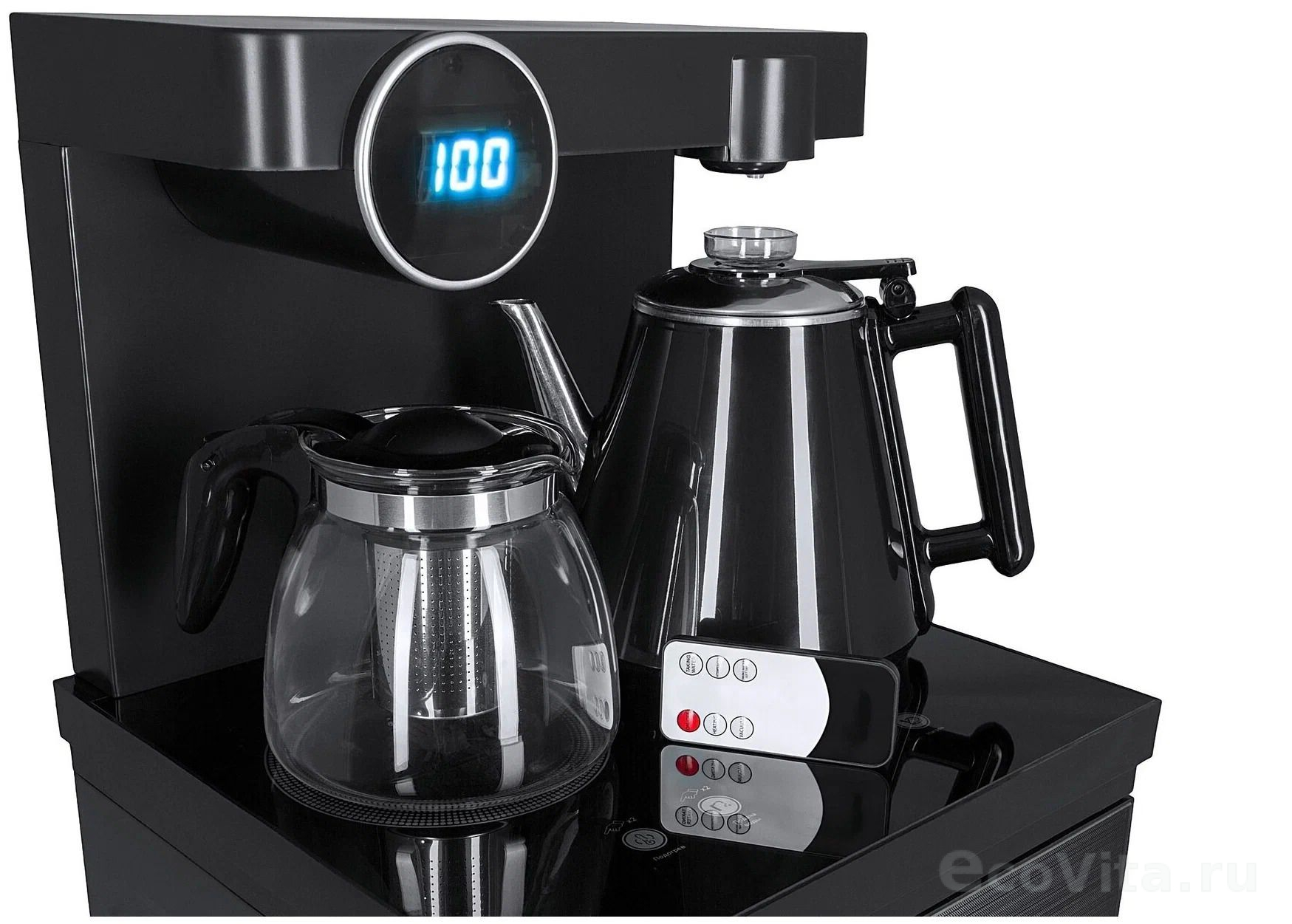 - Информационный дисплей в верхней части совмещен с кранами подачи воды. Два чайника: для кипячения и заварочный. Заварочному чайнику можно включить режим подогрева (~ до 60°С) до 3-х часов. Чайник кипячения - меньше греется, лучше сохраняет температуру. Подача воды в него возможна без открытия крышки. Нагрев воды в чайнике включается вручную. Автоотключение нагрева при температуре 100°С.