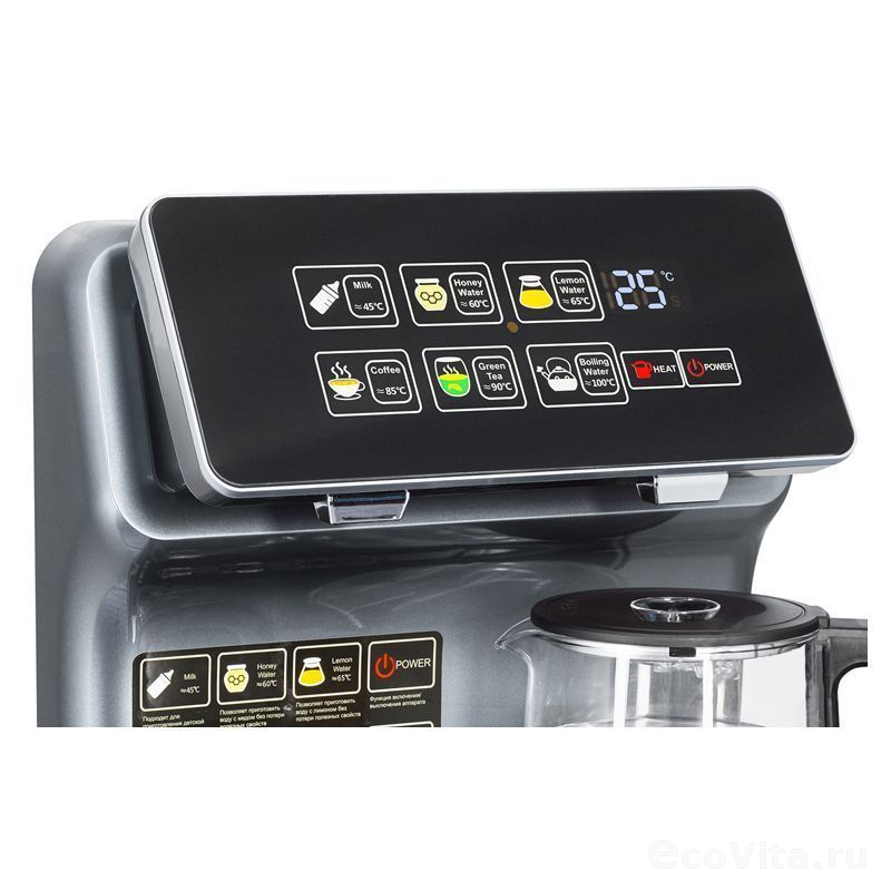 Тиабар оснащен пультом дистанционного управления, работающим на расстоянии до 7 метров. Сенсорной панелью на русском языке. Двумя нагревательными панелями. Шесть режимов нагрева воды позволят задавать нужную температуру. Режимы маркированы в соответствии с напитками, для которых подходит эта температура: