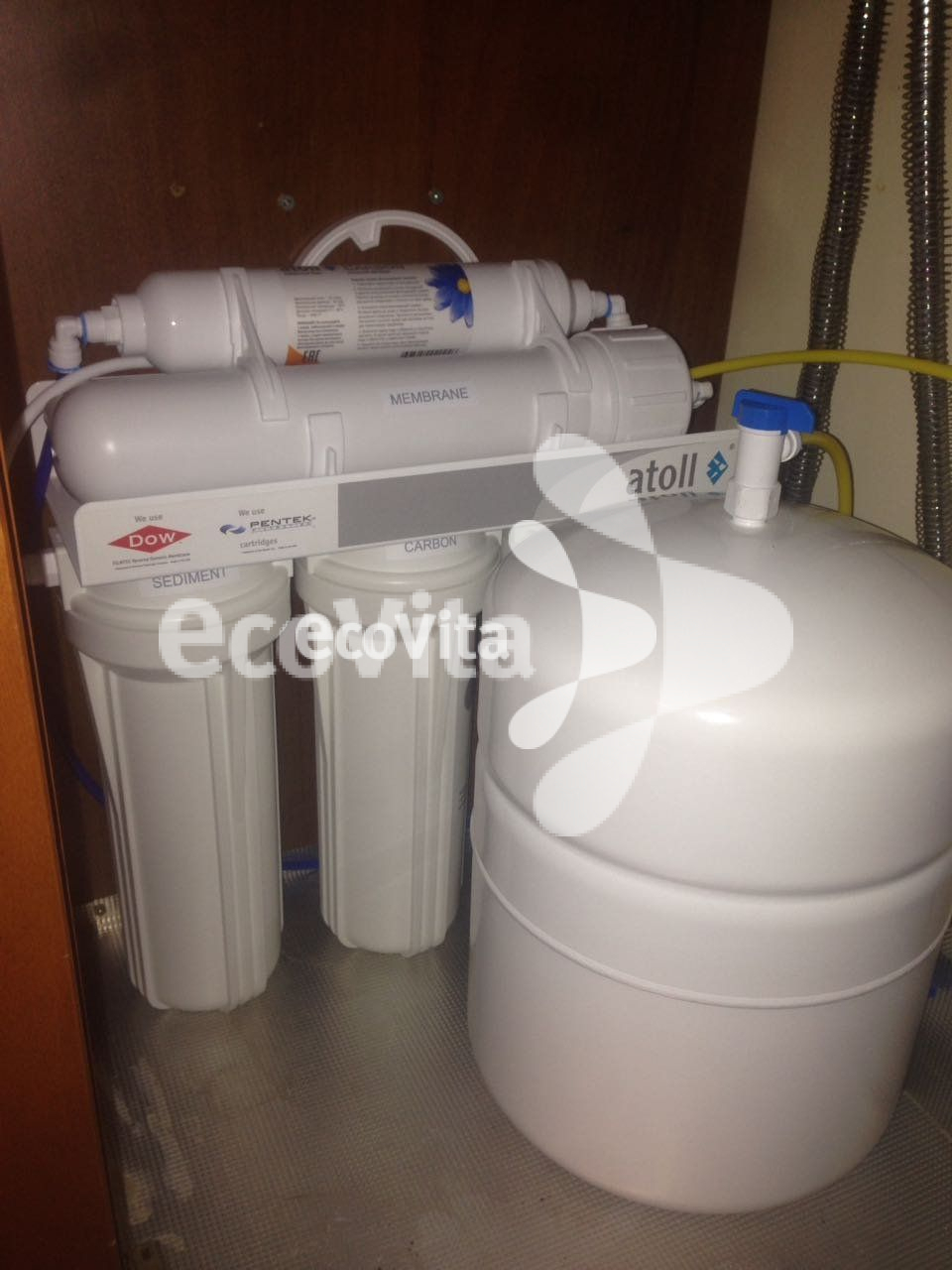 - Мембрана Atoll TW40-1812-50 – представляет собой полупроницаемый материал, через который могут пройти только молекулы воды и кислорода. Загрязнение фильтрующей поверхности мембраны необратимо и приводит к полной остановке процесса очистки воды. Поэтому применяется предварительная трехступенчатая фильтрация поступающей воды, а работа мембраны организована так, что все поступающие к ней загрязнения не оседают на ее поверхности, а смываются в канализацию;