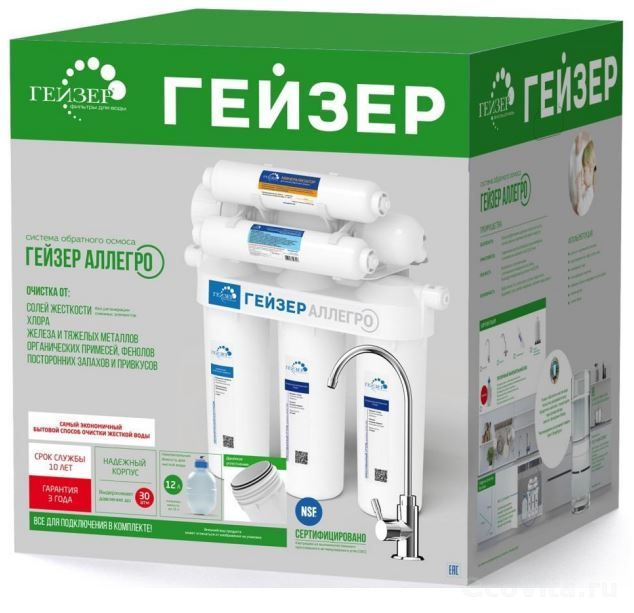 Очистка воды в фильтре с обратным осмосом Гейзер Аллегро осуществляется через полупроницаемую мембрану, поры которой пропускают только молекулы воды и кислорода и других растворенных газов. Так как размер молекул большинства примесей, а также бактерий и вирусов значительно больше молекул воды, мембрана успешно задерживает их.