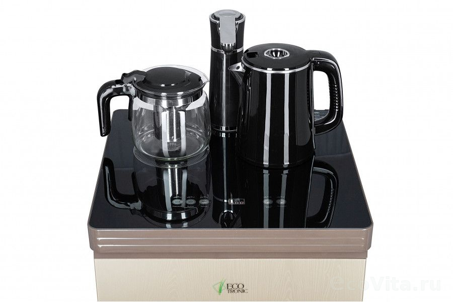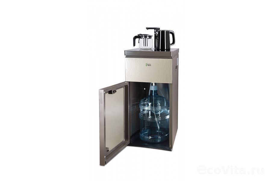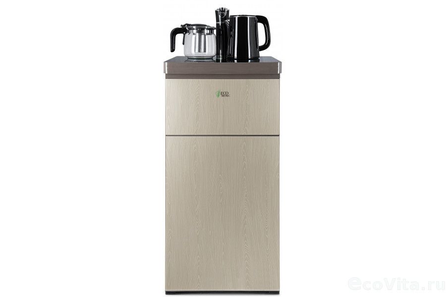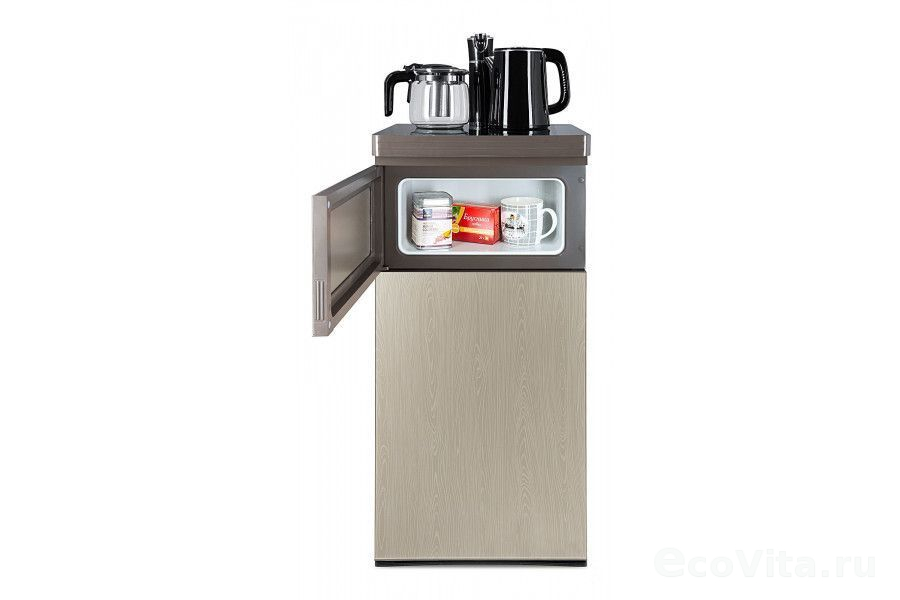 Тиабар Ecotronic TB7-LN gold – это напольный кулер с чайным столиком. Нижняя загрузка бутыли. Без охлаждения, только нагрев. Нагрев воды в чайнике до 100°С. Два чайника – для кипячения (изотермический) и заварочный. Шкафчик для хранения.