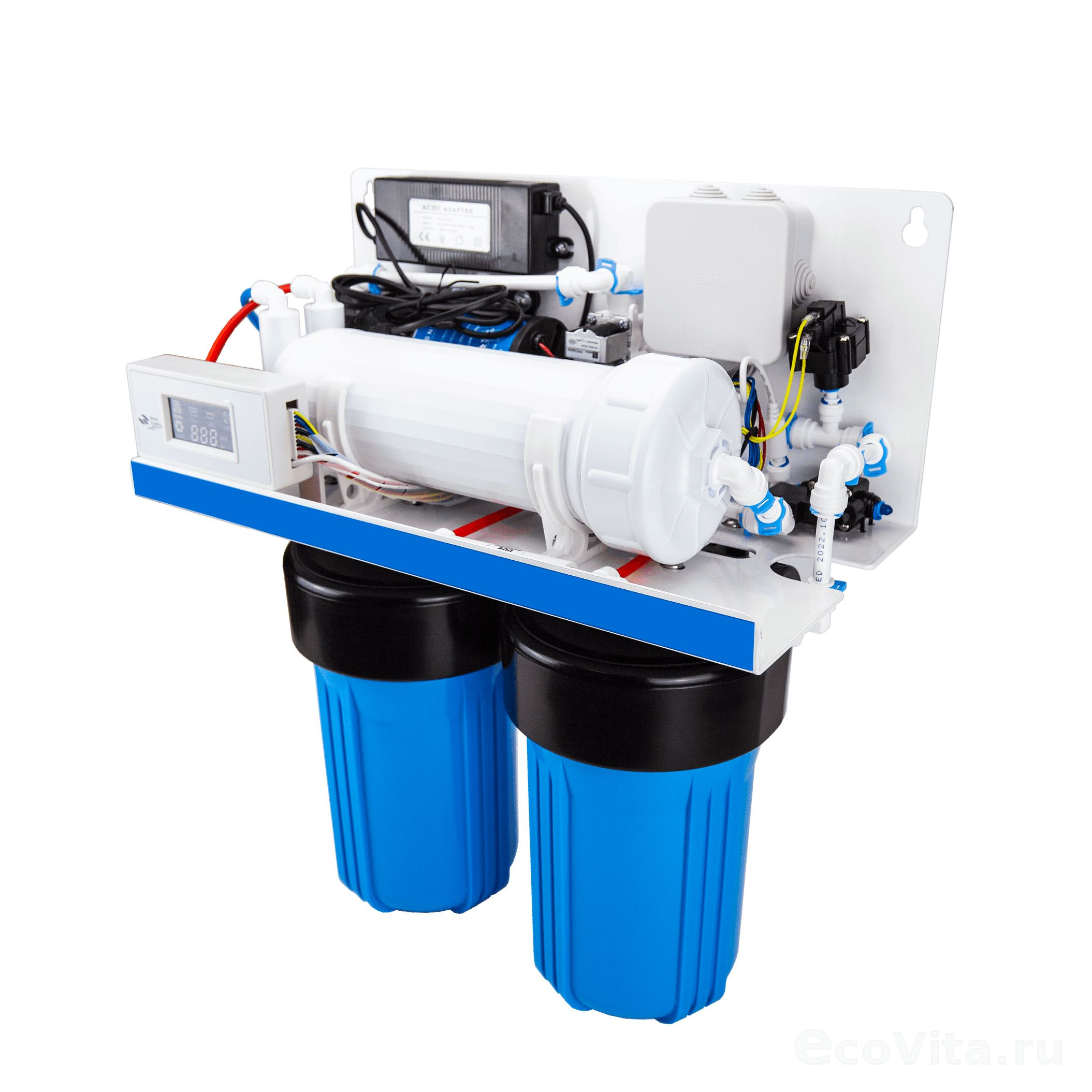 Ecovita Osmo 3-800P – система водоочистки с обратным осмосом, предназначенная для коммерческого использования. Эффективно очищает питьевую воду, устраняя вредные примеси: механические загрязнения (ржавчина, песок, ил и др.), растворённые вещества (свободный хлор, хлорорганику, тяжёлые металлы, соли жёсткости), а также бактерии, вирусы и прочие органические и неорганические соединения.