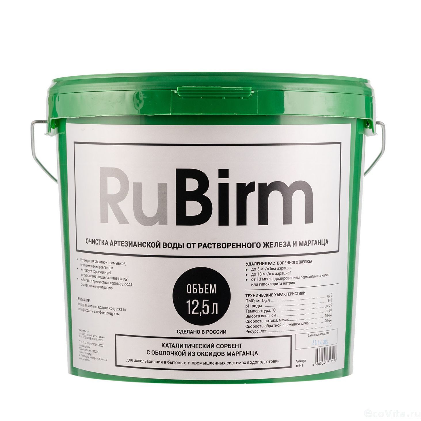 Rubirm 12.5 л (ведро) – фильтрующий материал, предназначенный для использования в промышленных и бытовых установках водоочистки. Каталитическая загрузка с медьсодержащей оболочкой очищает артезианскую воду от растворенного железа и марганца.