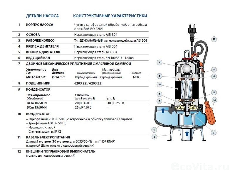 - рабочее колесо: двухканальное, нержавеющая сталь AISI 304.