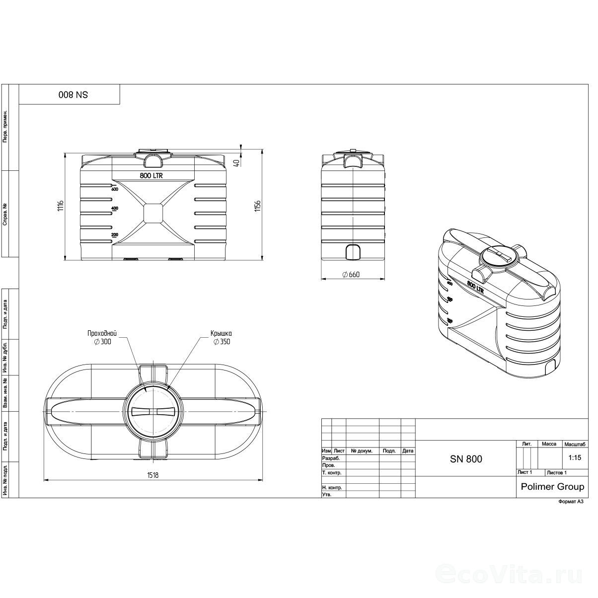 Пластиковый бак объемом 800 литров отличается своими компактными размерами, оптимизированными для удобной транспортировки и размещения внутри помещений, беспрепятственно проходящими через стандартные дверные проёмы.