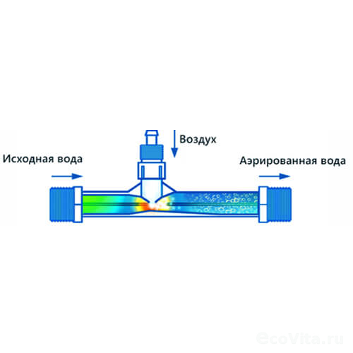 В насыщенной кислородом воде растворенное двухвалентное железо эффективно окисляется и выпадает в осадок, который затем задерживается фильтром для обезжелезивания воды. Помимо этого устраняются неприятные запахи и привкус, так как кислород активно вытесняет из воды углекислый газ, сероводород, метан и аммиак.