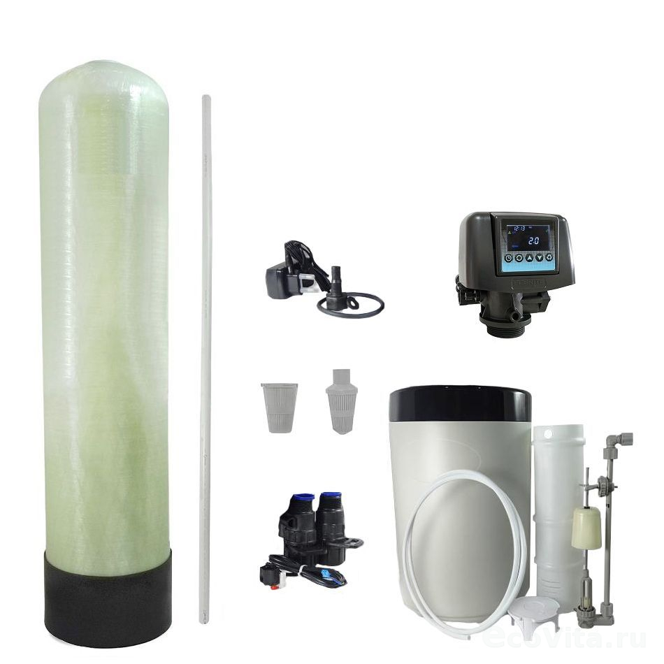 Умягчитель Ecovita EVS 13 OM с управлением по расходу воды. В зависимости от вида загрузки способен удалять соли жесткости, железо, марганец, органические вещества, тяжелые металлы и нитраты. Подходит для летней дачи и небольшого загородного дома.