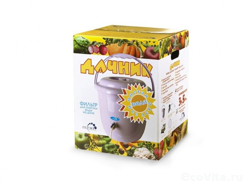 Гейзер Дачник представляет из себя ведро с 8 литрами фильтрующей загрузки, состоящей из 3-х слоев: