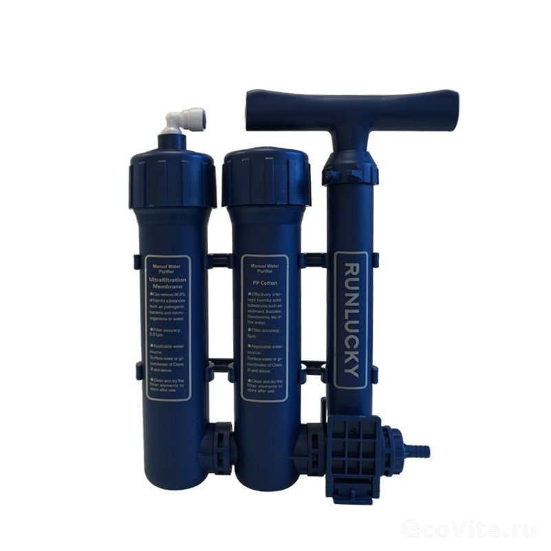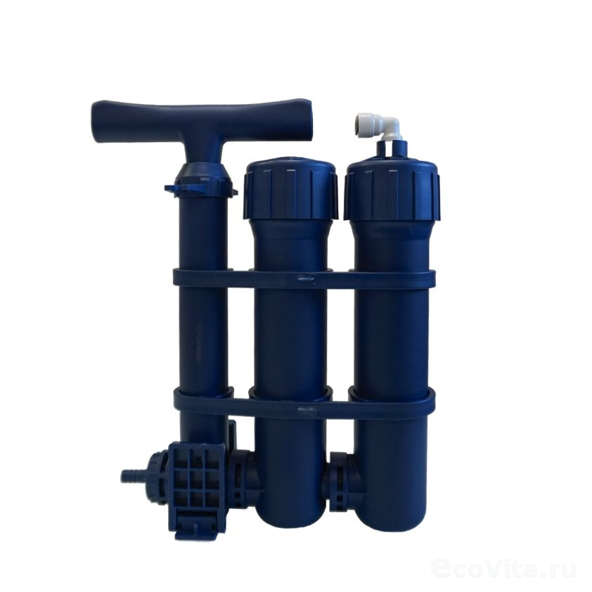 Фильтрация воды обеспечивается давлением, создаваемым ручным насосом. Электропитание не требуется.