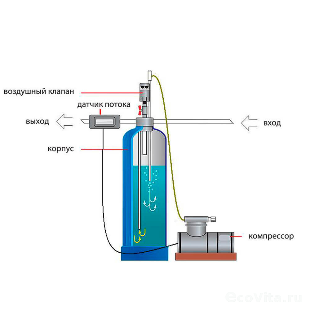 Для фильтрации окисленных соединений используются фильтры с зернистой загрузкой, обладающей большой грязеемкостью — приобретаются отдельно.