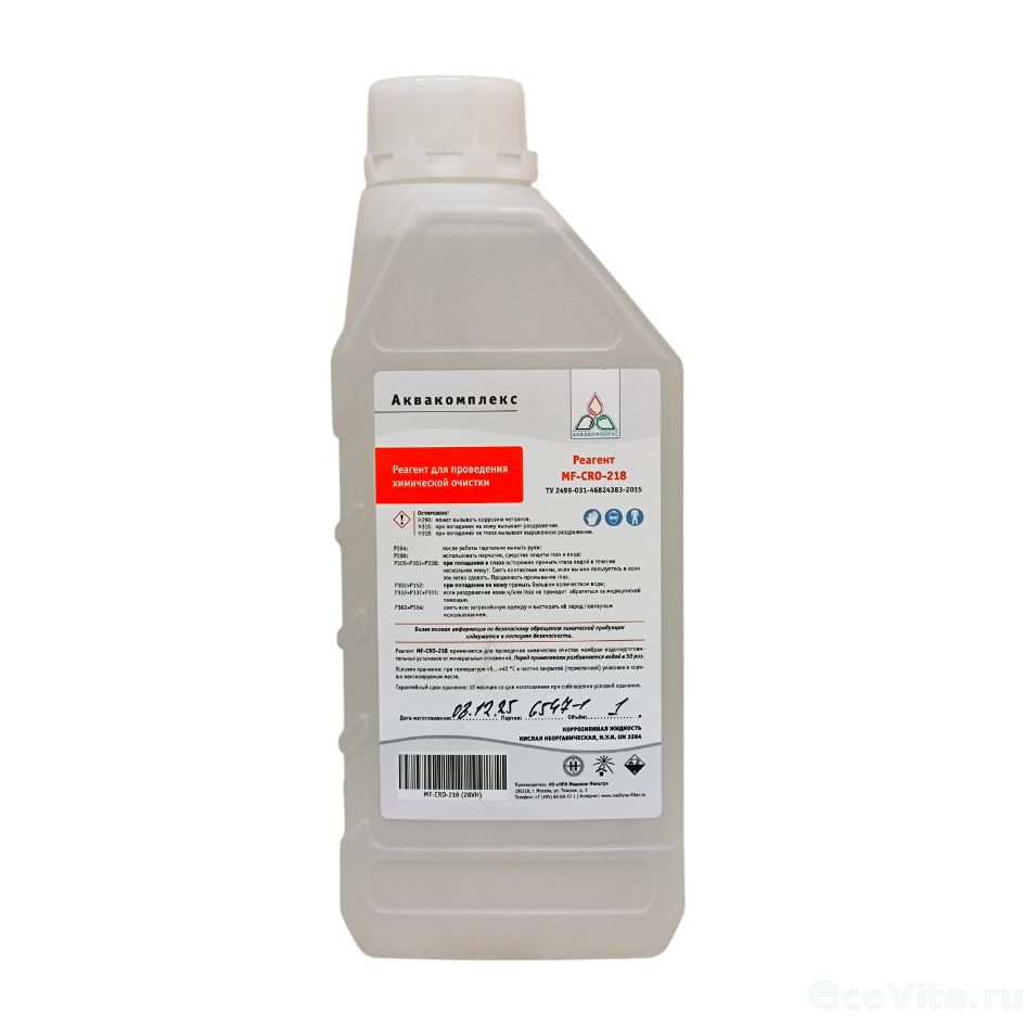 Реагент Аквакомплекс MF-CRO-218 1 л представляет собой концентрированную кислоту, предназначенную для очистки обратноосмотических мембран от минеральных отложений.