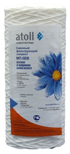 Фильтрующий сменный элемент Atoll МП-5 BB (намотка) предназначен для удаления механических загрязнений (песок, ржавчина, осадок). Обладает высокой устойчивостью к воздействию большинства кислот, щелочей, агрессивных жидкостей и газов.