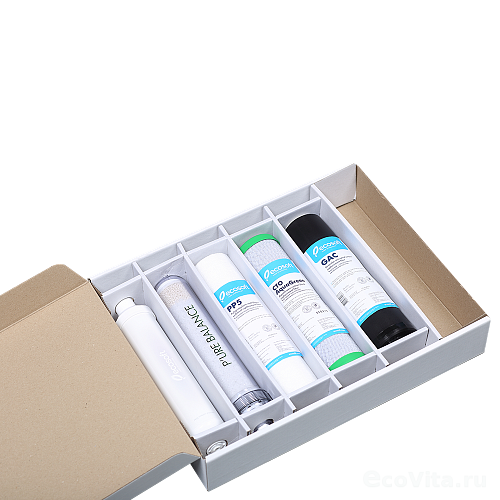 Комплект картриджей Ecosoft P'URE Balance для системы обратного осмоса Ecosoft P’URE Balance с минерализатором. Комплект содержит предфильтры защищающие мембрану и постфильтры улучшающие вкус воды.