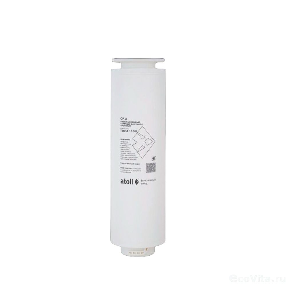 Комбинированный трехступенчатый картридж Atoll TWIST 1000 CP-A (2в1 - префильтр) используется для замены отработавшего элемента системы обратного осмоса Atoll TWIST 1000i.