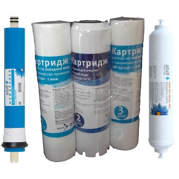 Полный набор картриджей для замены элементов в системах обратного осмоса Atoll A-550 М Патриот. Содержит 3 предфильтра, мембрану и постфильтр-минерализатор.