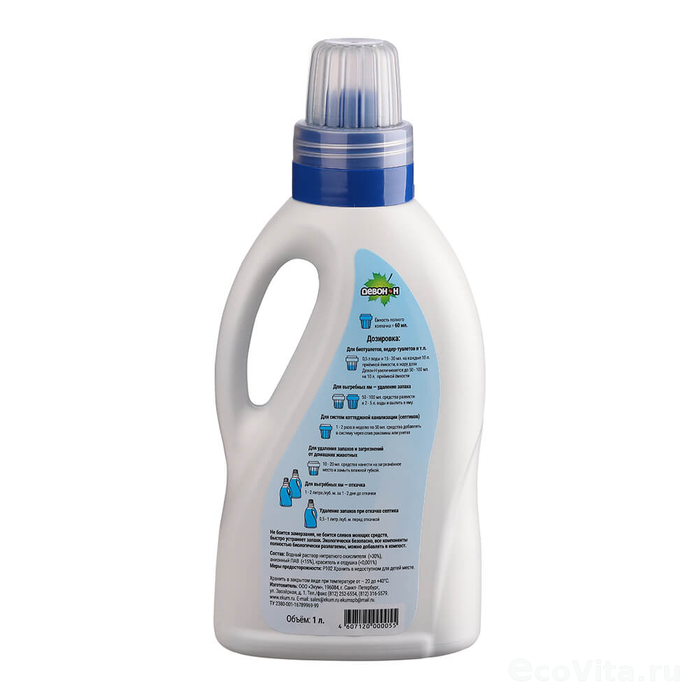 Концентрированное средство Девон-Н 1 литр - универсальный уничтожитель запахов широкого спектра действия в виде жидкого концентрата. Подходит для использования в дачных туалетах, выгребных ямах, для удаления рвотных, фекальных запахов (в садовых и дачных туалетах, а также от домашних животных), а также неприятных запахов гниения (например, в компосте). Разлагает и химически связывает все пахучие компоненты.