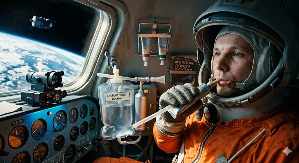 Юрий Алексеевич провел в космосе 108 минут. Казалось бы, зачем для такого короткого срока решать сложные вопросы жизнеобеспечения? Но ученым было важно понять: может ли человек физически глотать и усваивать воду в невесомости. Во время полета Ю. А. Гагарин сообщил: «Произвел прием воды и пищи. Воду и пищу принял нормально, принимать можно. Никаких физиологических затруднений при этом я не ощущал». Уже на Земле Юрий Алексеевич в своей книге «Дорога в космос» так вспоминал этот эксперимент: «Я не чувствовал во время полёта ни голода, ни жажды. Но по заданной программе в определённое время поел и пил воду из специальной системы водоснабжения».