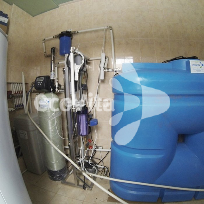 На входе воды в систему водоснабжения дома установлен фильтр с загрузкой из ионообменной смолы, необходимый для снижения содержания железа и жесткости в исходной воде. Далее установлен обратноосмотический фильтр производительностью 100 л/час. Так как производительность обратноосмотической системы не велика, далее установлена емкость, которая позволяет накапливать воду для ее дальнейшего использования. Подача воды из емкости производится насосной станцией Grundfos MQ 3-45. На выходе установлена ультрафиолетовая лампа, которая уничтожает все бактерии, которые могут образоваться в результате застаивания воды в накопительной емкости.