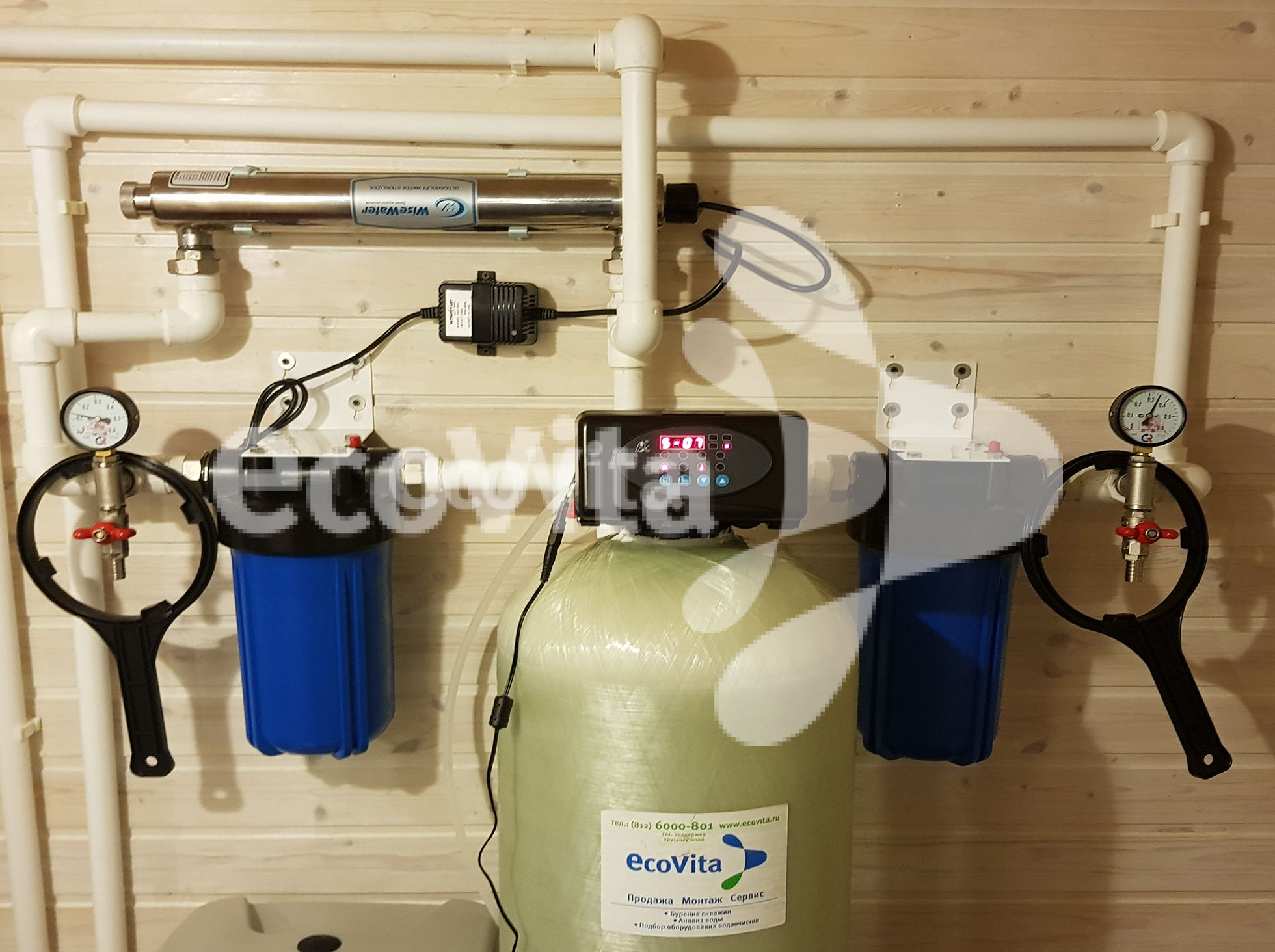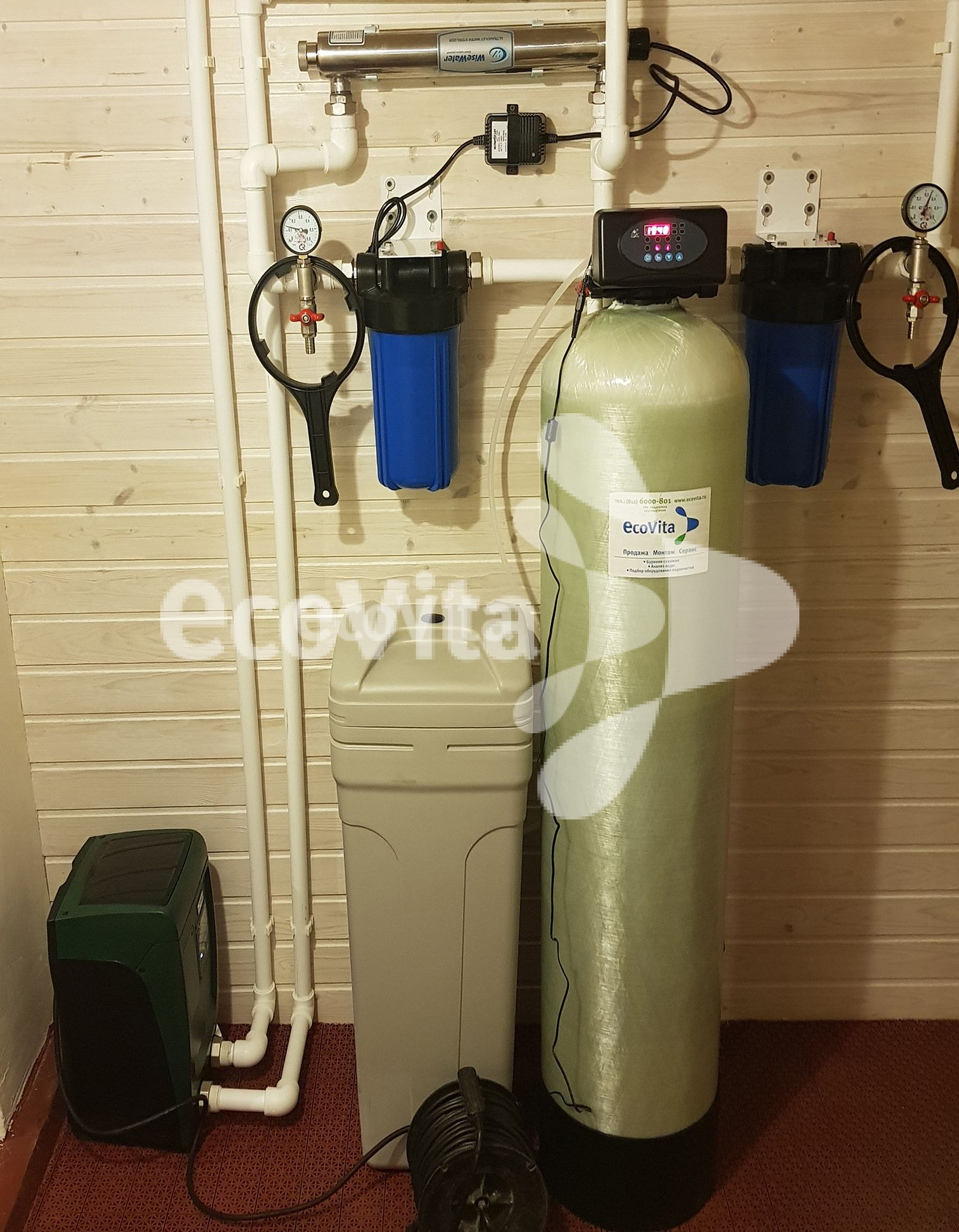 Установка системы обезжелезивания и умягчения воды для загородного дома.