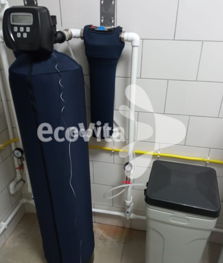 Система включает умягчитель с многофункциональной смолой Экотар B30. Использование многофункциональной загрузки снижает концентрацию железа с 17 мг/л до 0.12 мг/л. Жесткость снижена с 8 мг*экв/л до 0.5 мг*экв/л. Для сохранности оборудование упаковано в термочехлы.