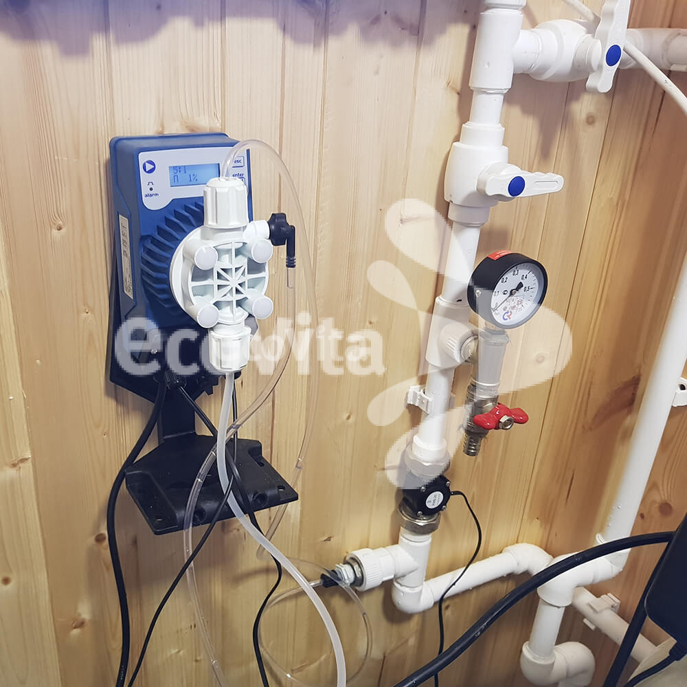 - Блок дозации гипохлорита натрия SEKO, состоящий из дозирующего насоса Seko Kompact DPT 200, емкости для реагента и импульсного водосчетчика