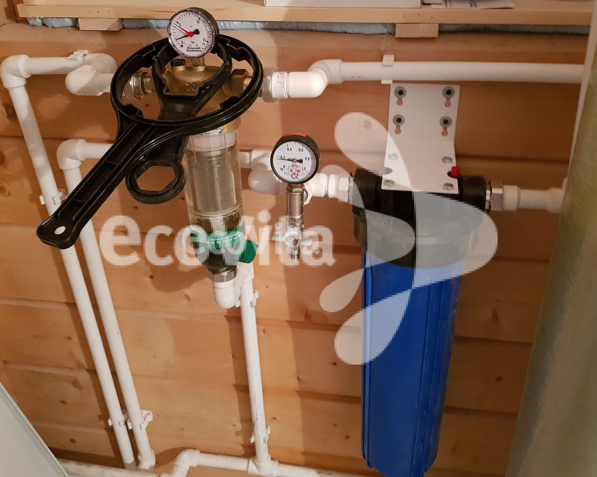- На входе фильтр грубой механической очистки Honeywell F76S 3/4" AA с обратной промывкой для удаления крупных механических взвесей и защиты управляющего клапана засыпного фильтра;