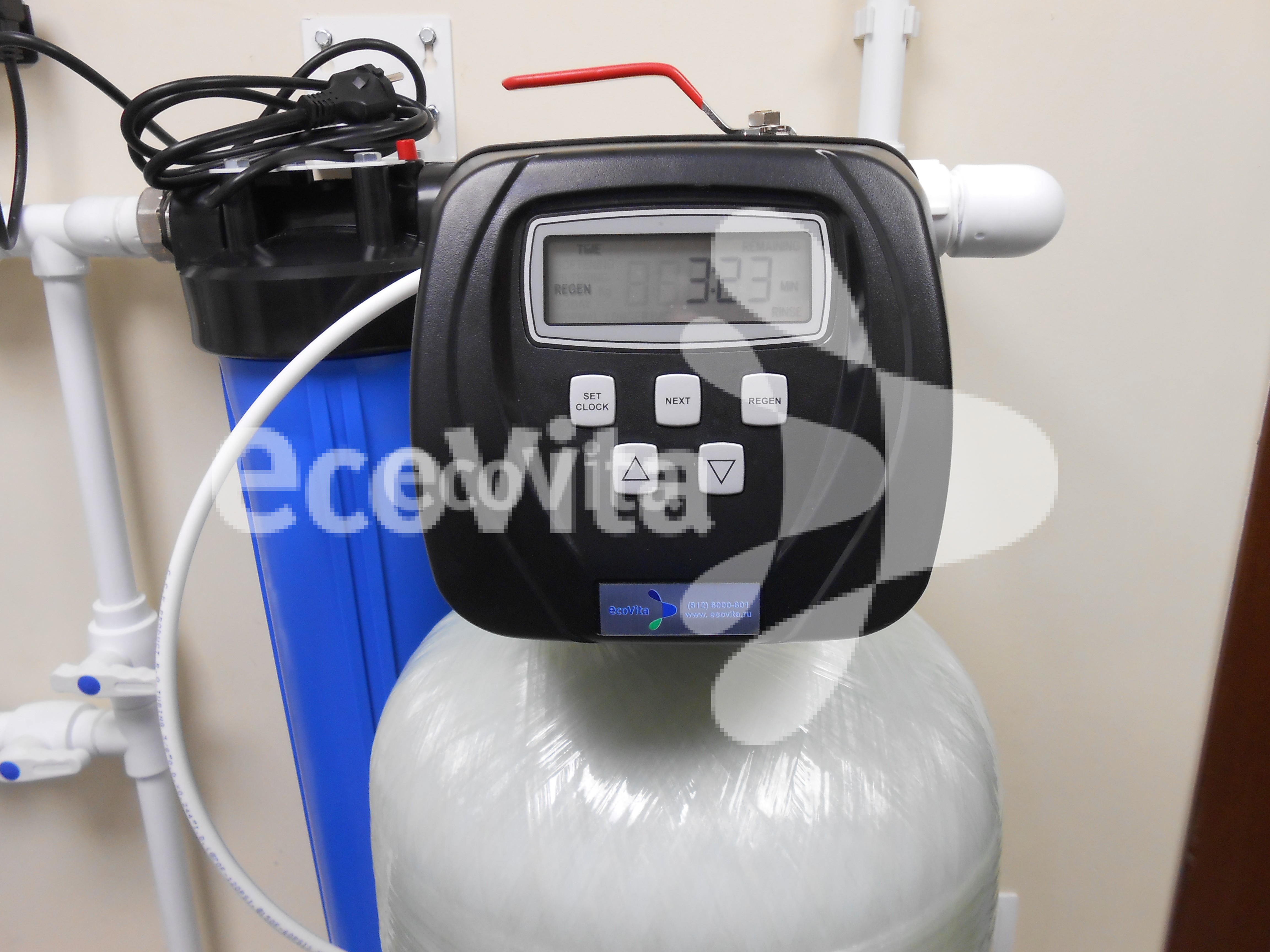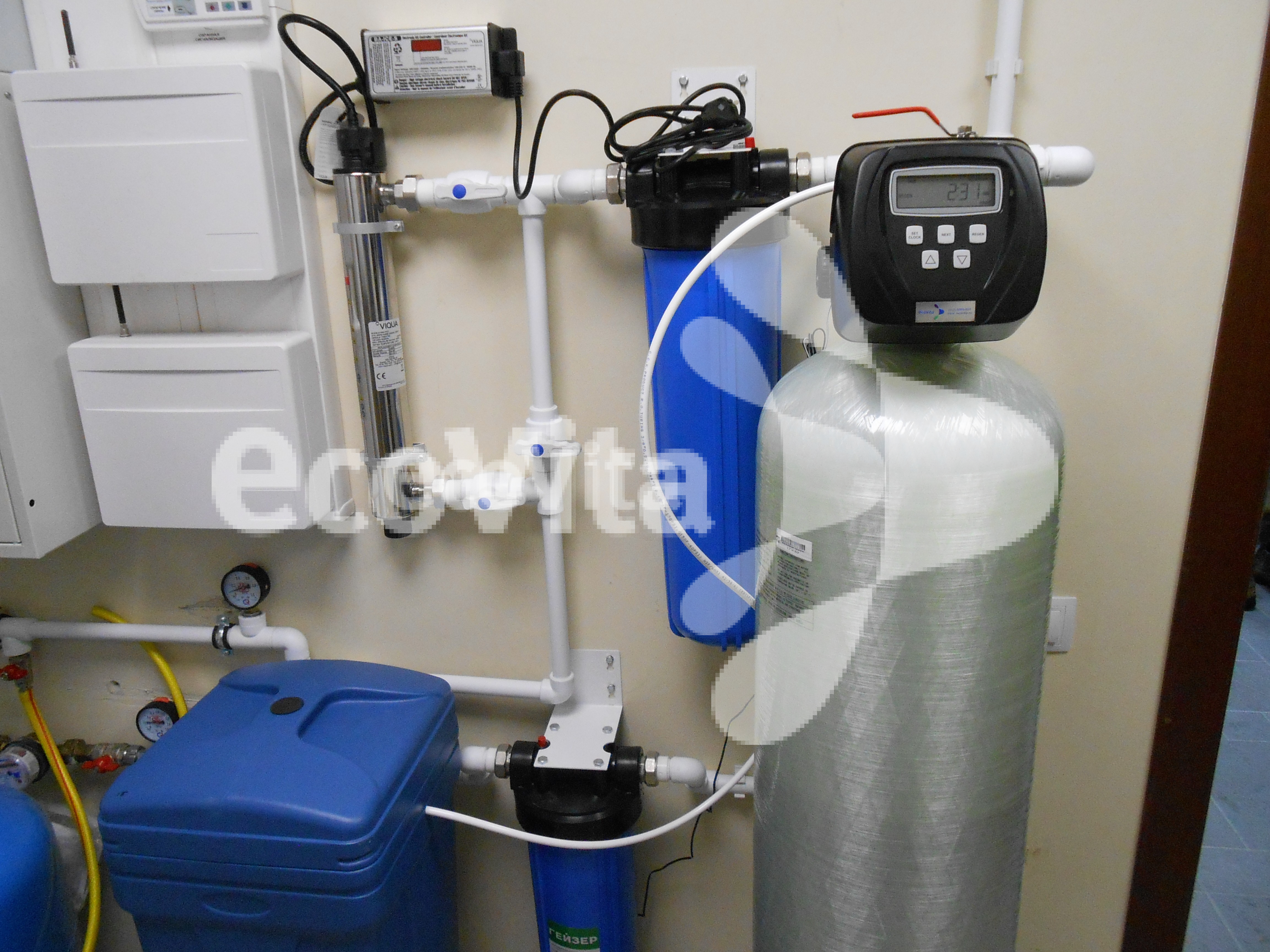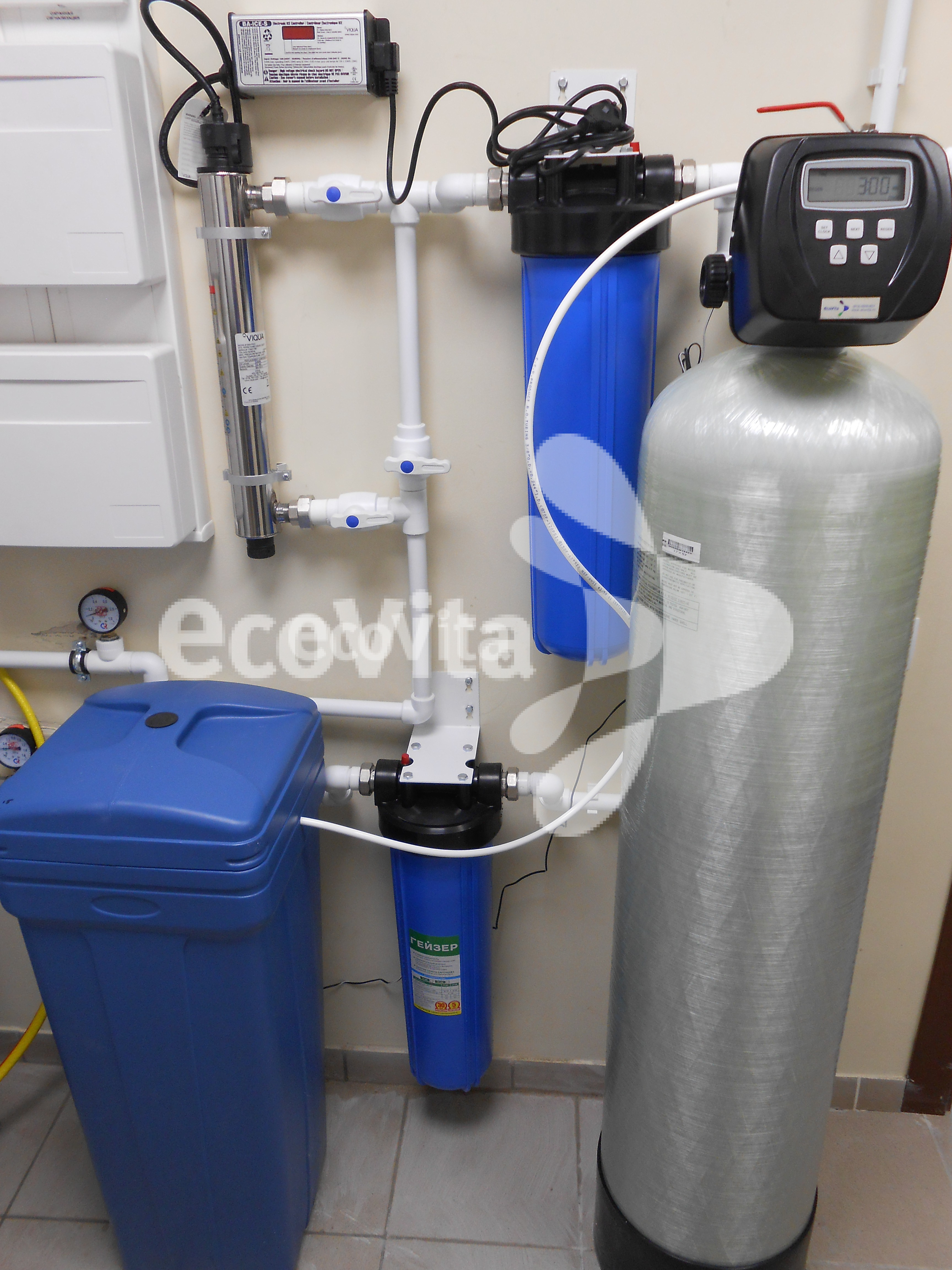 Для очистки воды в системе установлен фильтр Гейзер 20BB с картриджем Ecovita PP 10 20BB. Для устранения избытка солей жесткости использован умягчитель Ecovita EVS 12L3 с фильтрующей средой — ионнообменной смолой Lewatit S 1567. Также ситема оснащена Гейзер корпус 20BB с угольным картриджем Ecovita ЭФАУ 20BB. Для обеспечения бактериологической безопасности используется стерилизатор VIQUA S5Q-PA/2. Для получения высококачественной питьевой воды, под мойку установлена система обратного осмоса Atoll A-550m STD (A-560Em).