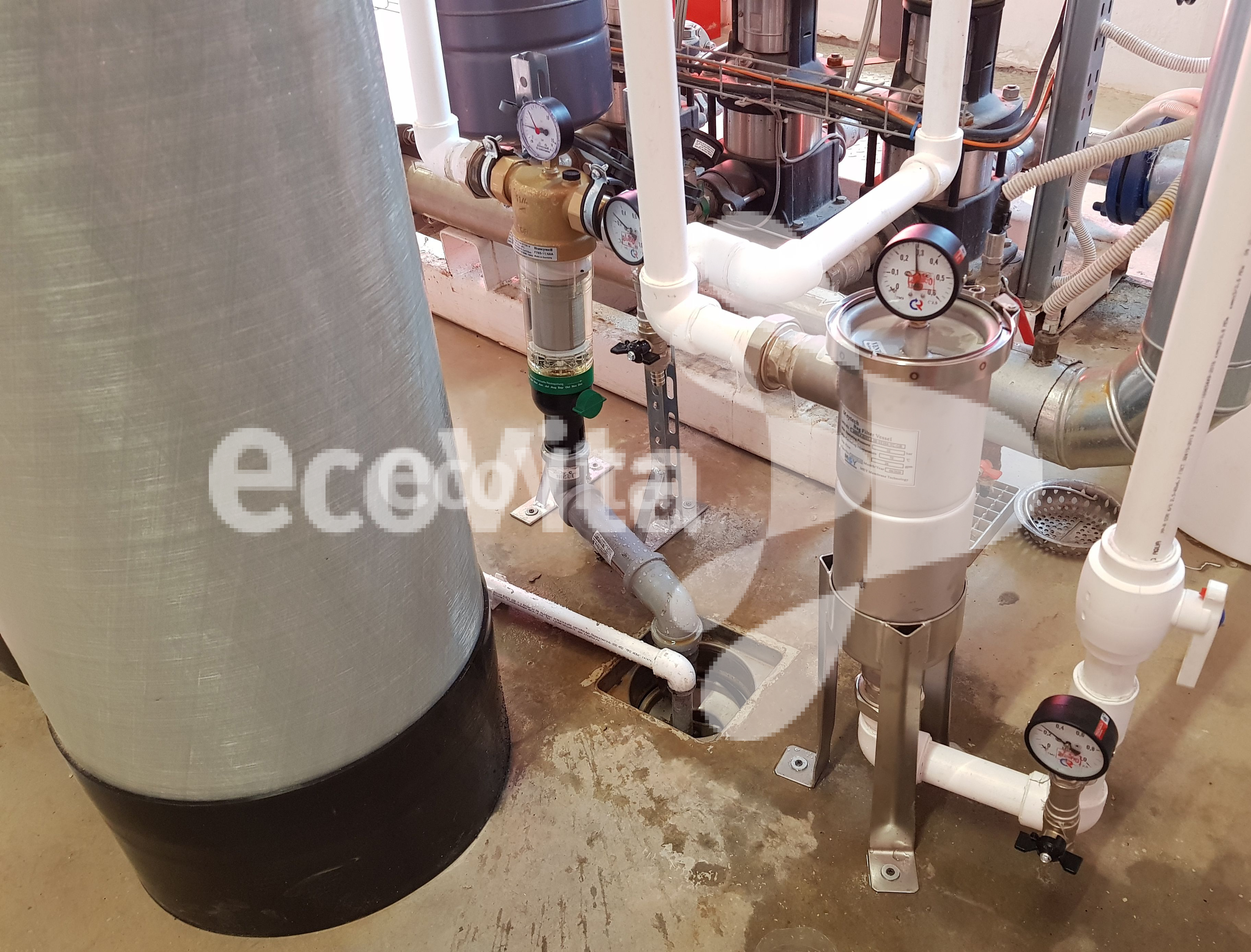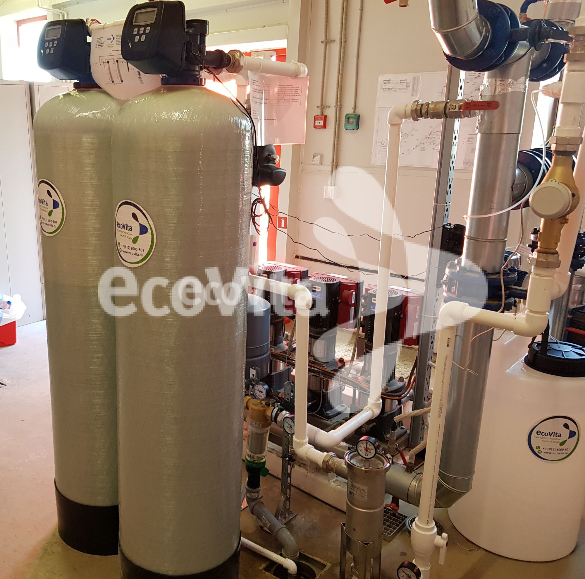 Монтаж системы очистки воды для пищевого производства. Заказчику требовалась очистка воды из системы городского водоснабжения с превышениями по показателям «мутность», «железо общее», до нормативов СанПиН 2.1.4.1074-01, а также снизить показатель воды «жесткость» и предотвратить появление коррозии в системе горячего водоснабжения.